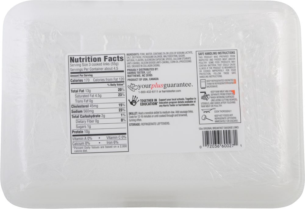 170 calories 3 cooked links. Previously handled frozen for your protection. US inspected and passed by Department of Agriculture. Your Plus Guarantee: 1-800-432-6111 or harristeeter.com.