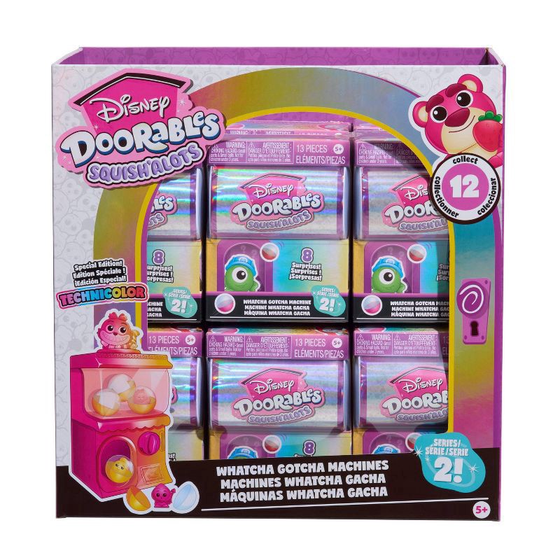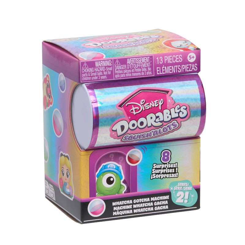 Turn a knob to discover tiny surprises inside the Disney Doorables Squish'Alots Whatcha Gotcha Mini Machines. Each blind package contains 1 of 12 collectible toy figures to top the machine, 3 micro fi…