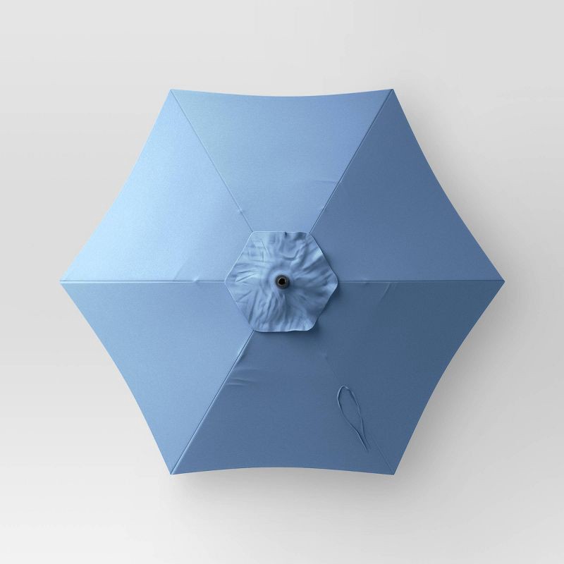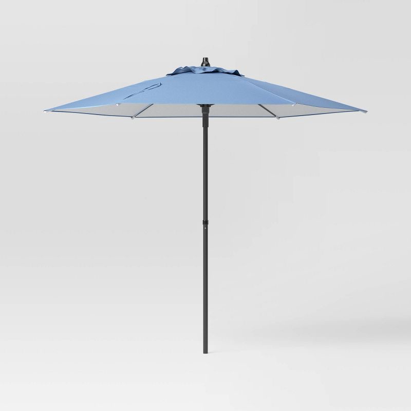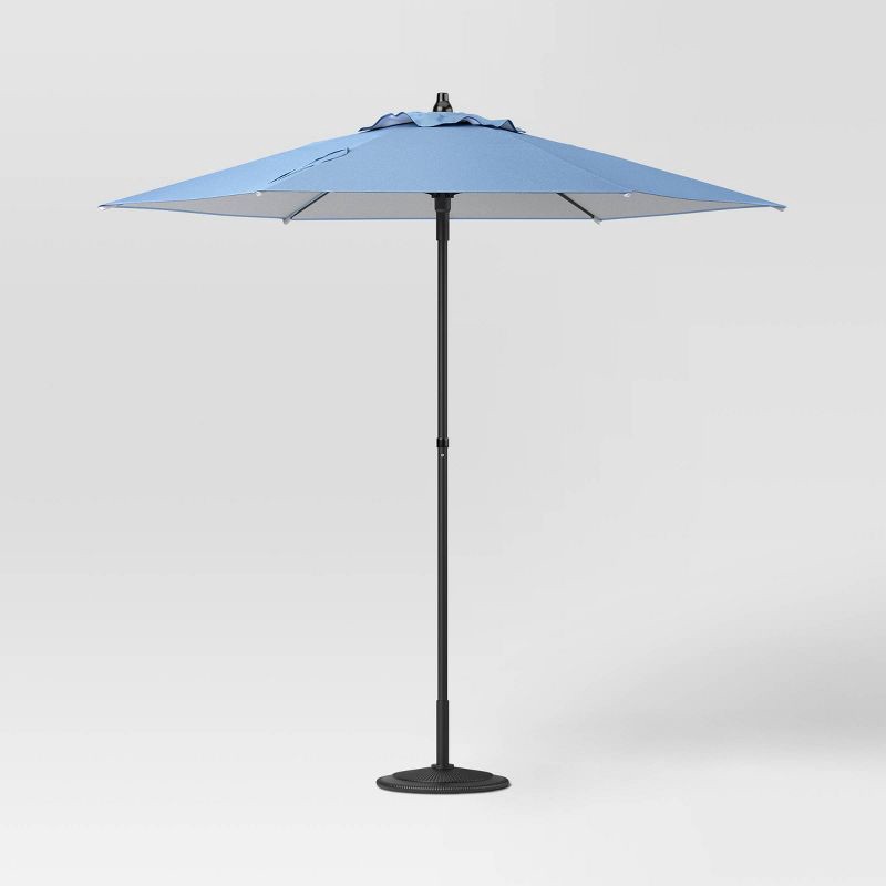 Set up shade anywhere in your patio or yard with this 7-Foot Outdoor Market Umbrella from Room Essentials™. Set and supported on a black metal frame, this market-style outdoor umbrella features a roun…