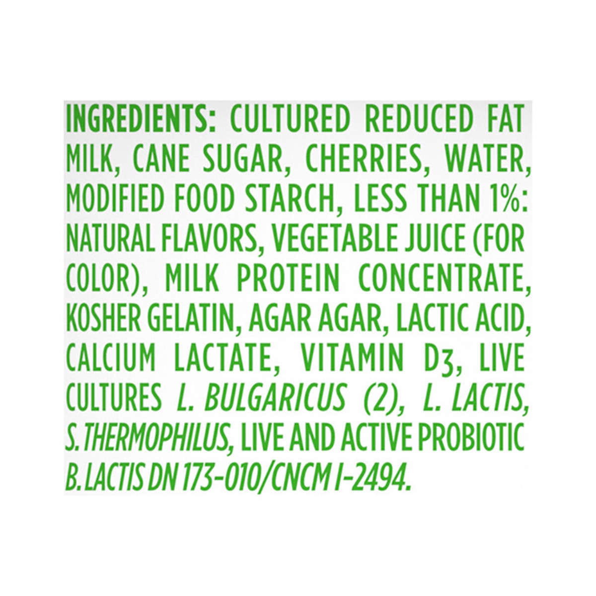 Cultured Reduced Fat Milk, Cane Sugar, Cherries, Water, Modified Food Starch, Less than 1%: Natural Flavors, Vegetable Juice (for Color), Milk Protein Concentrate, Kosher Gelatin, Agar Agar, Lactic Ac…