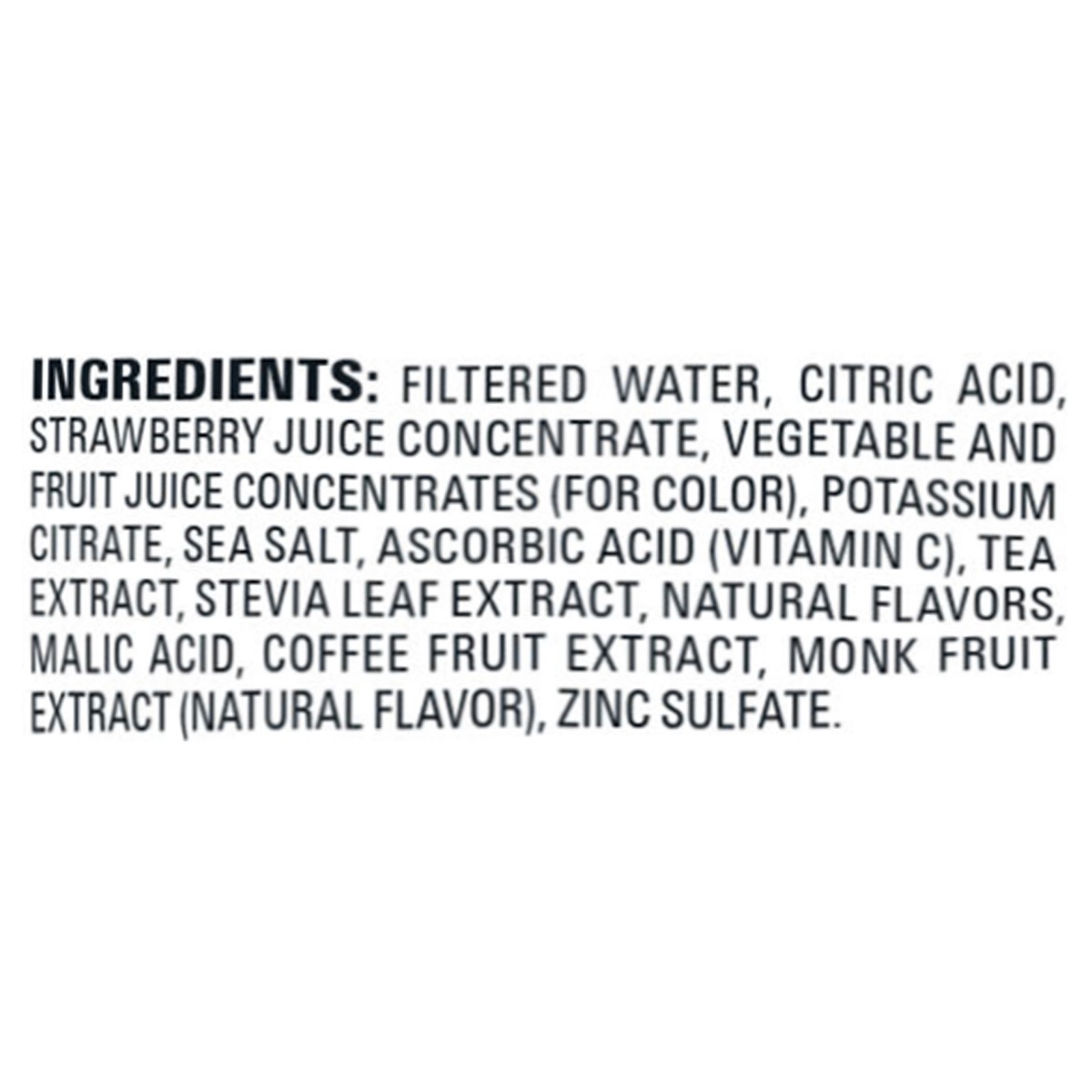 Filtered Water, Citric Acid, Strawberry Juice Concentrate, Vegetable and Fruit Juice Concentrates (for Color), Potassium Citrate, Sea Salt, Ascorbic Acid (Vitamin C), Tea Extract, Stevia Leaf Extract,…