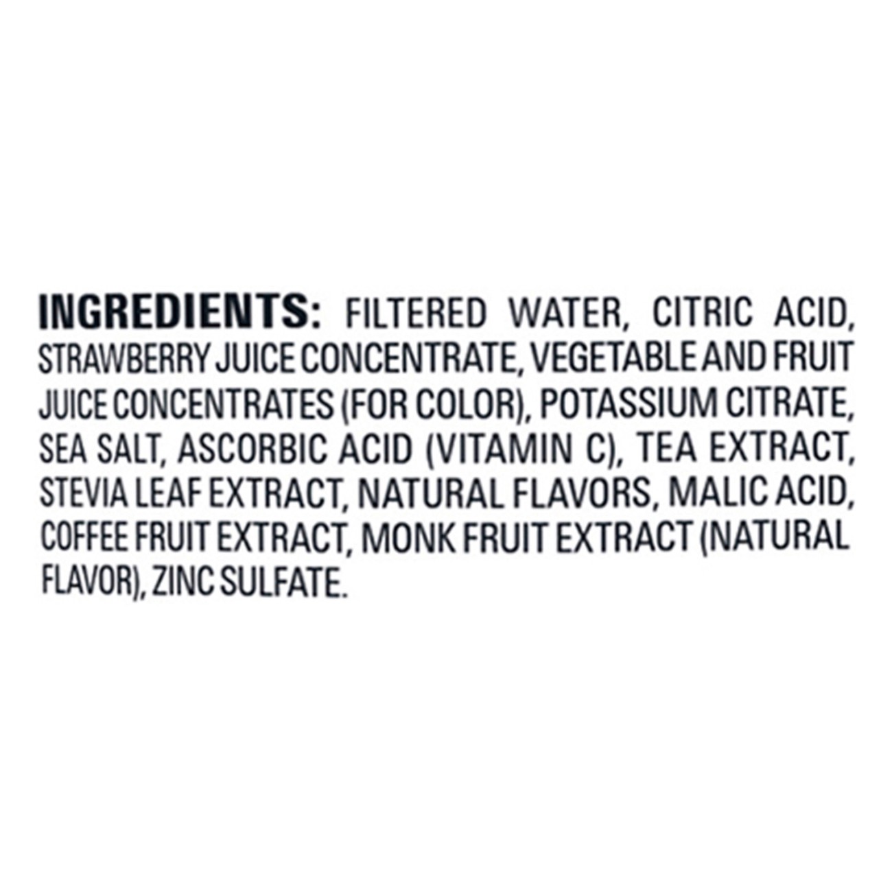 Filtered Water, Citric Acid, Strawberry Juice Concentrate, Vegetable and Fruit Juice Concentrates (for Color), Potassium Citrate, Sea Salt, Ascorbic Acid (Vitamin C), Tea Extract, Stevia Leaf Extract,…