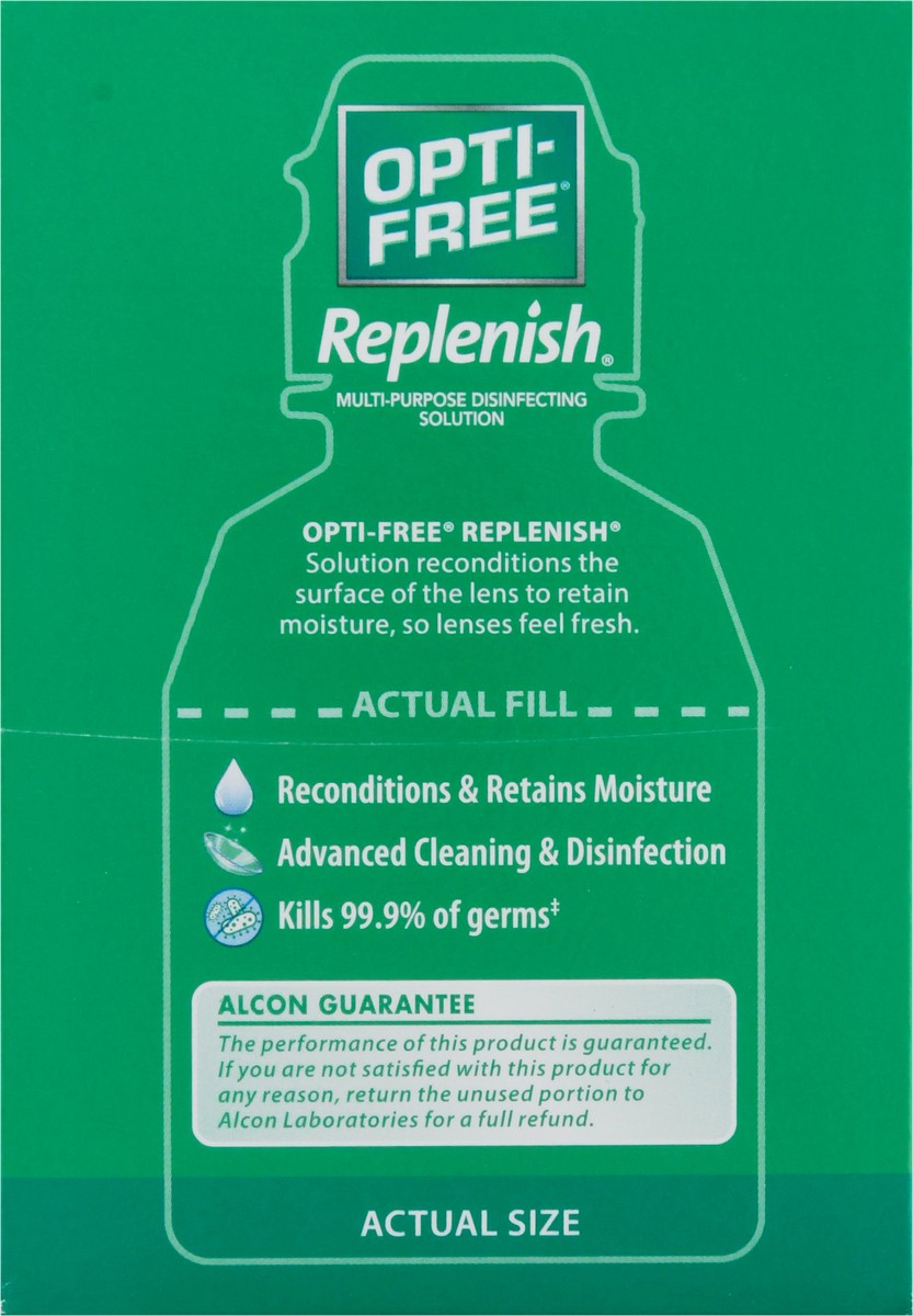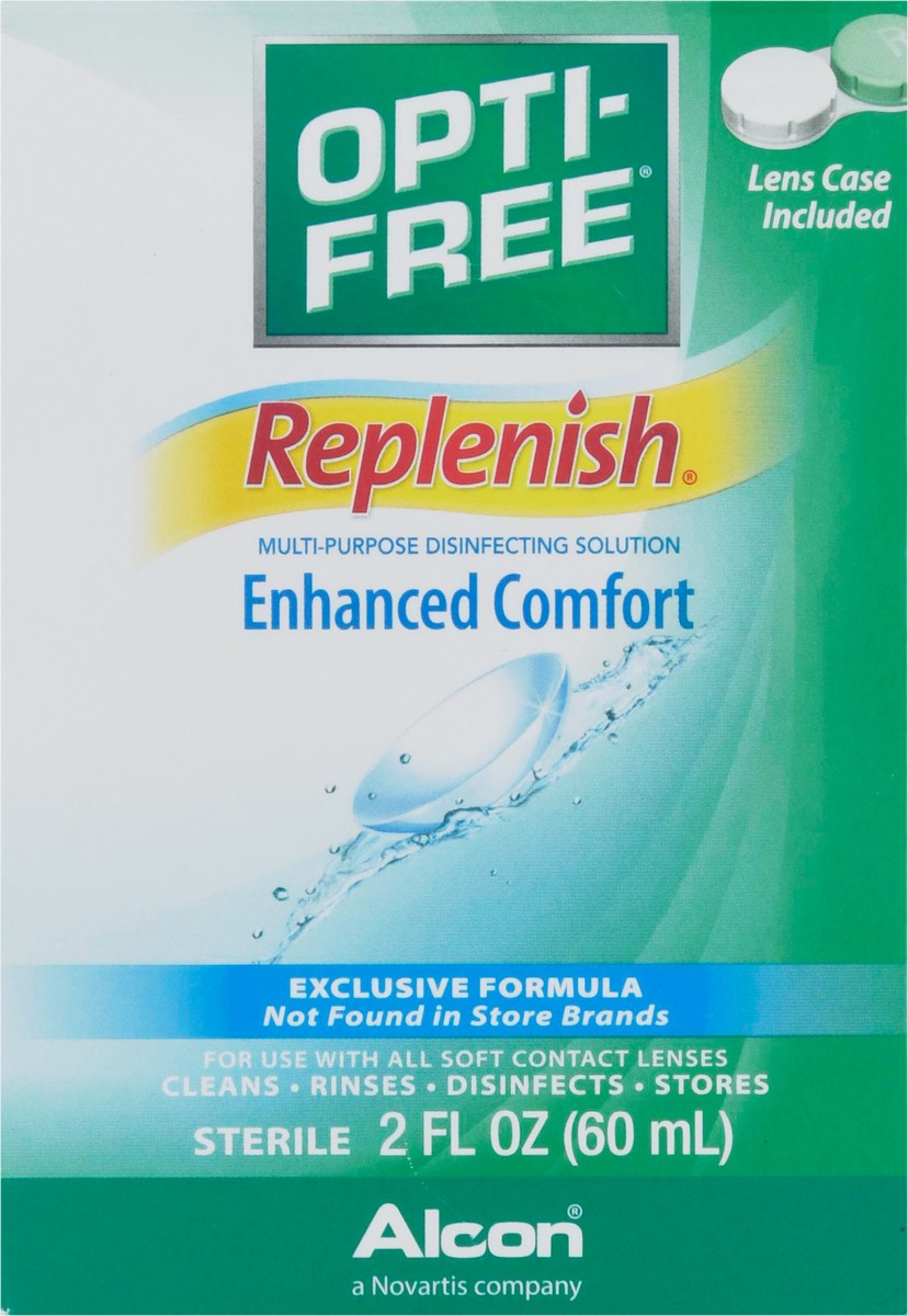 Lens case included. Exclusive formula not found in store brands. For use with all soft contact lenses. Cleans. Rinses. Disinfects. Stores. Alcon a Novartis company. Opti-free Replenish: Solution recon…