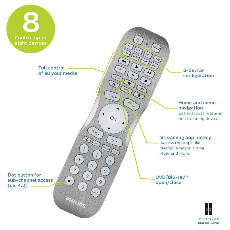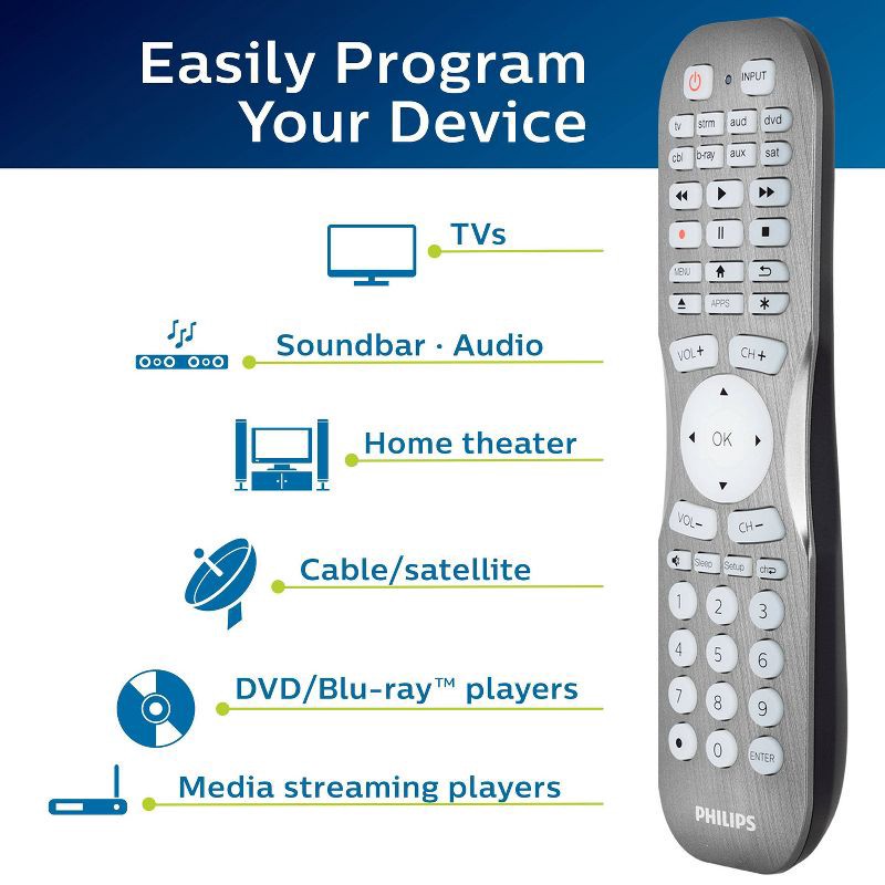 Add a touch of sophistication to your home theater setup with the Philips 8-Device Universal Remote Control in a brushed graphite finish. Designed to operate up to eight separate devices, including yo…
