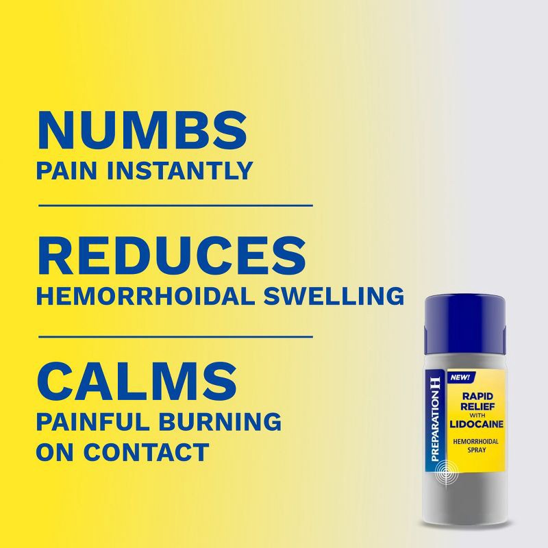 - 3.8 oz bottle of Preparation H Rapid Relief Hemorrhoidal Spray with LidocaineHemorrhoid treatment delivers rapid numbing relief of pain, itching and burningA pain relief spray that contains the highest strength lidocaine available and phenylephrine HCLA spray that is non-messy and easy to apply at any angleGet comfortable with it with Preparation H hemorrhoids treatmentHSA and FSA eligible item. Medicare Advantage OTC (MAOTC) eligible. *OTC benefits and eligible products vary by plan. Check your plan for specific details.