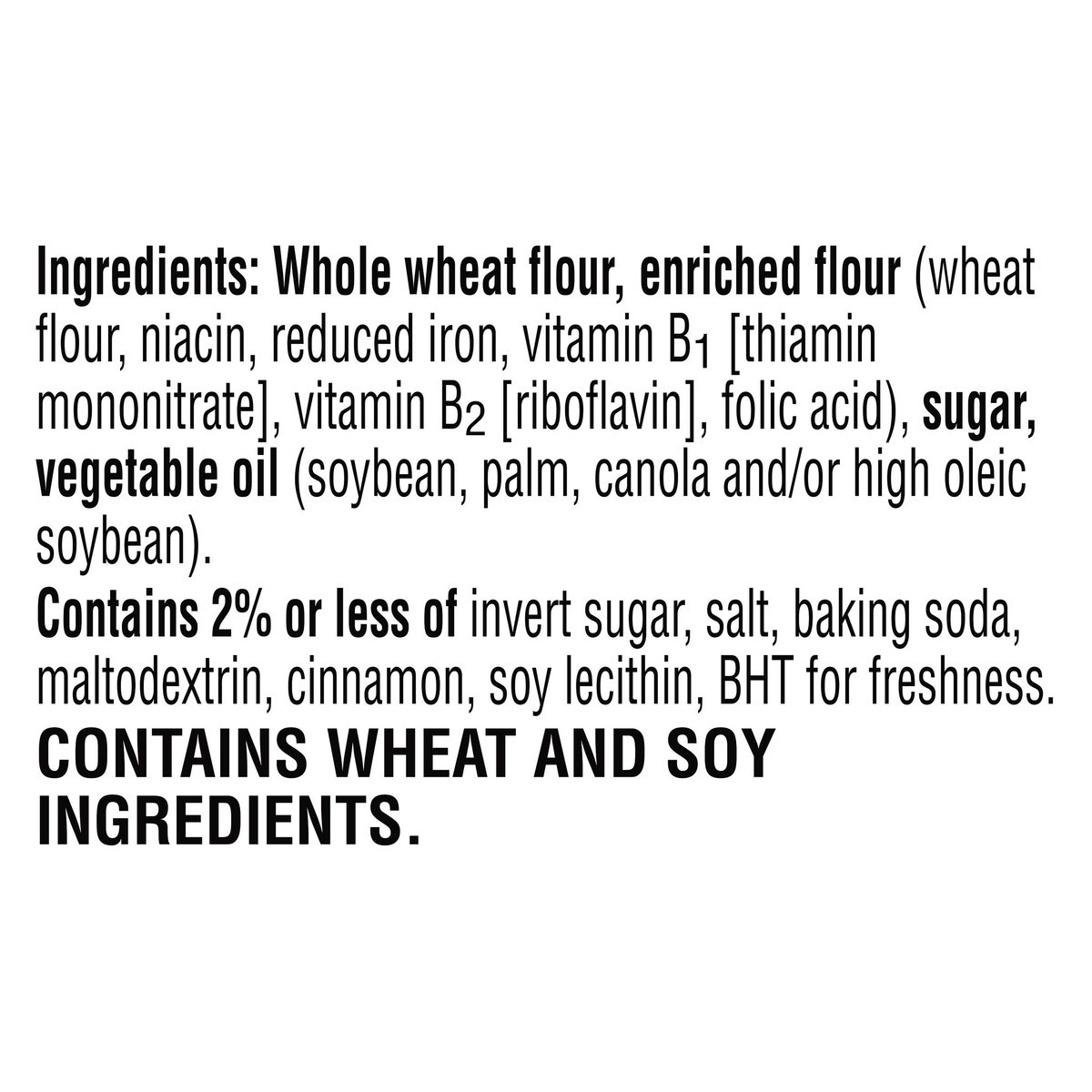 Whole Wheat Flour, Enriched Flour (Wheat Flour, Niacin, Reduced Iron, Vitamin B1 [Thiamin Mononitrate], Vitamin B2 [Riboflavin], Folic Acid), Sugar, Vegetable Oil (Soybean, Palm, Canola and/or High Ol…