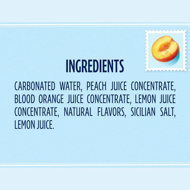 Carbonated Water, Peach Juice Concentrate, Blood Orange Juice Concentrate, Lemon Juice Concentrate, Natural Flavors, Sicilian Salt, Lemon Juice.