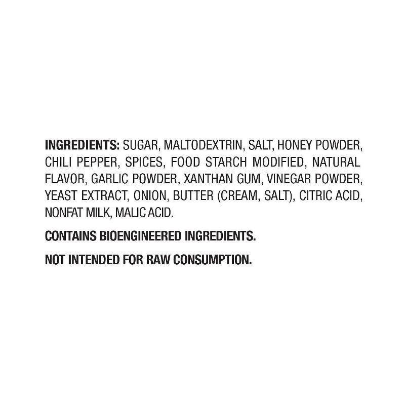 Sugar, Maltodextrin, Salt, Honey Powder, Chili Pepper, Spices, Food Starch Modified, Natural Flavor, Garlic Powder, Xanthan Gum, Vinegar Powder, Yeast Extract, Onion, Butter (Cream, Salt), Citric Acid…