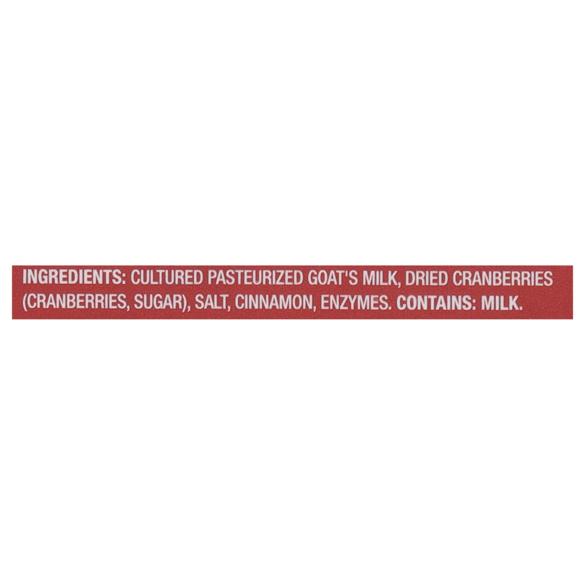 Cultured Pasteurized Goat's Milk, Dried Cranberries (Cranberries, Sugar), Salt, Cinnamon, Enzymes.
