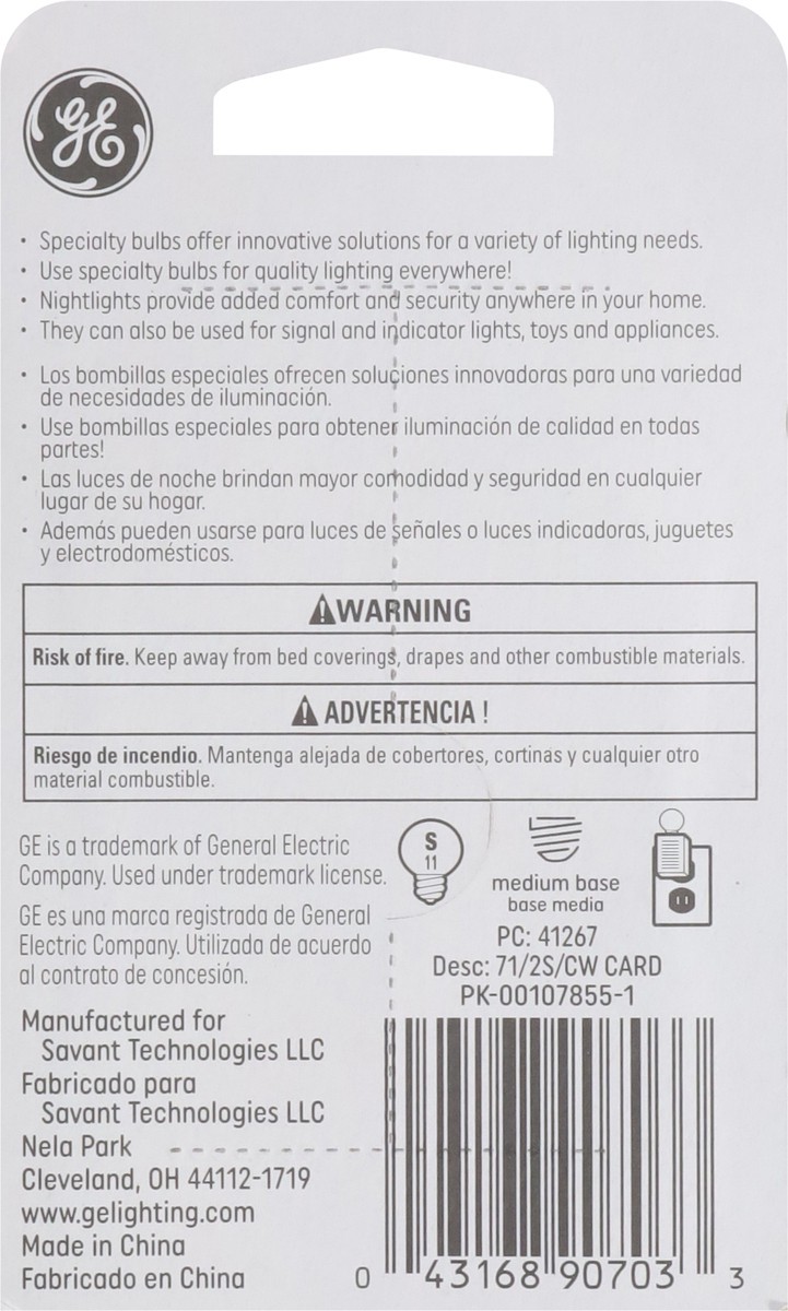 GE Specialty White Nightlight Bulb is a 7.5-Watt, S11 bulb that acts as a replacement for most nightlights, giving you long-lasting, quality lighting anywhere you need it. Perfect for reliable illumin…