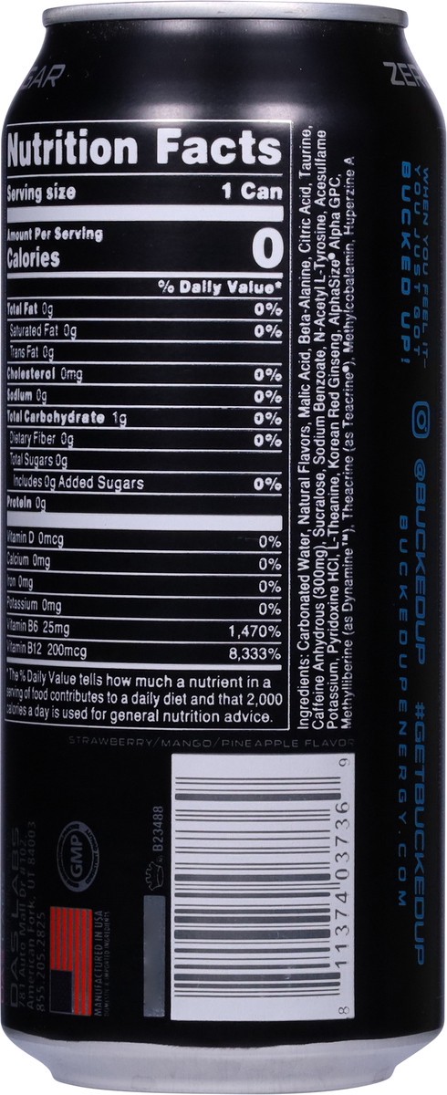 Natural & artificial flavors. Zero sugars. When you feel it, you just got Bucked up! Tea Crine. Dynamine. Alphasize. GMP: Good manufacturing practice consistent quality. buckedupenergy.com. Instagram …