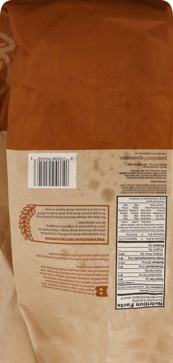 Unbleached Wheat Flour (Wheat Flo Malted Barley Flour), Filtered Water, Whole Wheat Flour, Brown Sugar, Rye Flour, Sesame Seeds, Sunflower Seeds, Rolled Oats, Flax Seeds, Pumpkin Seeds, Sea Salt, Yeas…