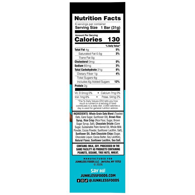 - 100% whole grain oats and dark chocolate chips