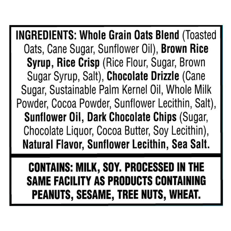 Whole Grain Oats Blend (Toasted Oats, Rolled Oats, Cane Sugar, Sunflower Oil), Brown Rice Syrup, Rice Crisp (Rice Flour, Sugar, Brown Sugar Syrup, Salt), Dark Chocolate Chips (Sugar, Chocolate Liquor,…