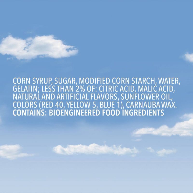 Corn Syrup, Sugar, Modified Corn Starch, Water, Gelatin, Less Than 2% of: Citric Acid, Malic Acid, Natural and Artificial Flavors, Sunflower Oil, Colors (Red 40, Yellow 5, Blue 1), Carnauba Wax