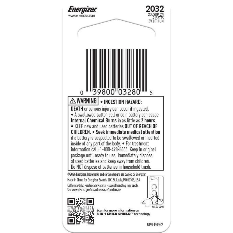 - 2 pack of Energizer 2032 Batteries, 3V Lithium Coin Batteries. Packaging may vary