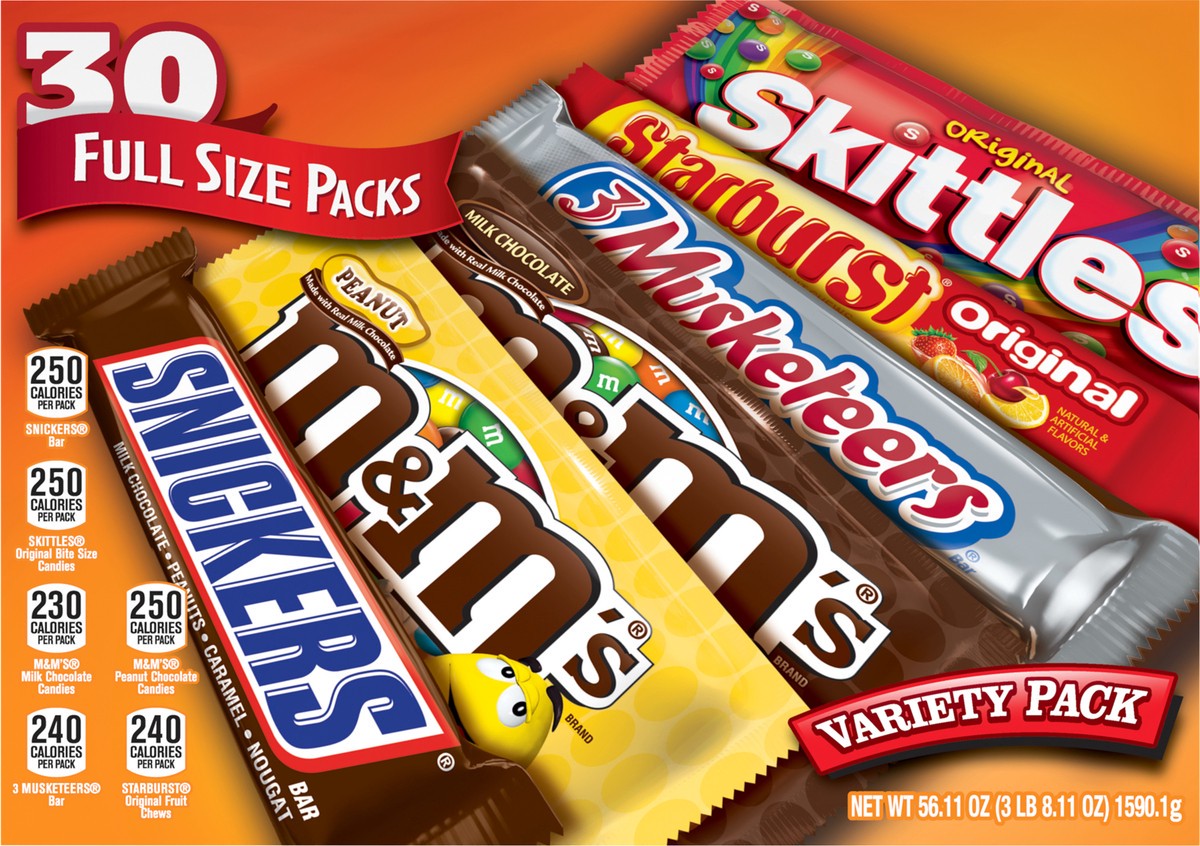This full sized candy bars variety pack features thirty singles size SNICKERS Milk Chocolate Bars, M&M'S Peanut Chocolate Candy, M&M'S Milk Chocolate Candy, SKITTLES Original Chewy Candy, STARBURST Or…