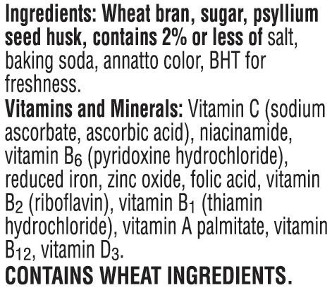Ingredients: Wheat Bran, Sugar, Psyllium Seed Husk, Contains 2% Or Less Of Salt, Baking Soda, Annatto Color, Bht For Freshness