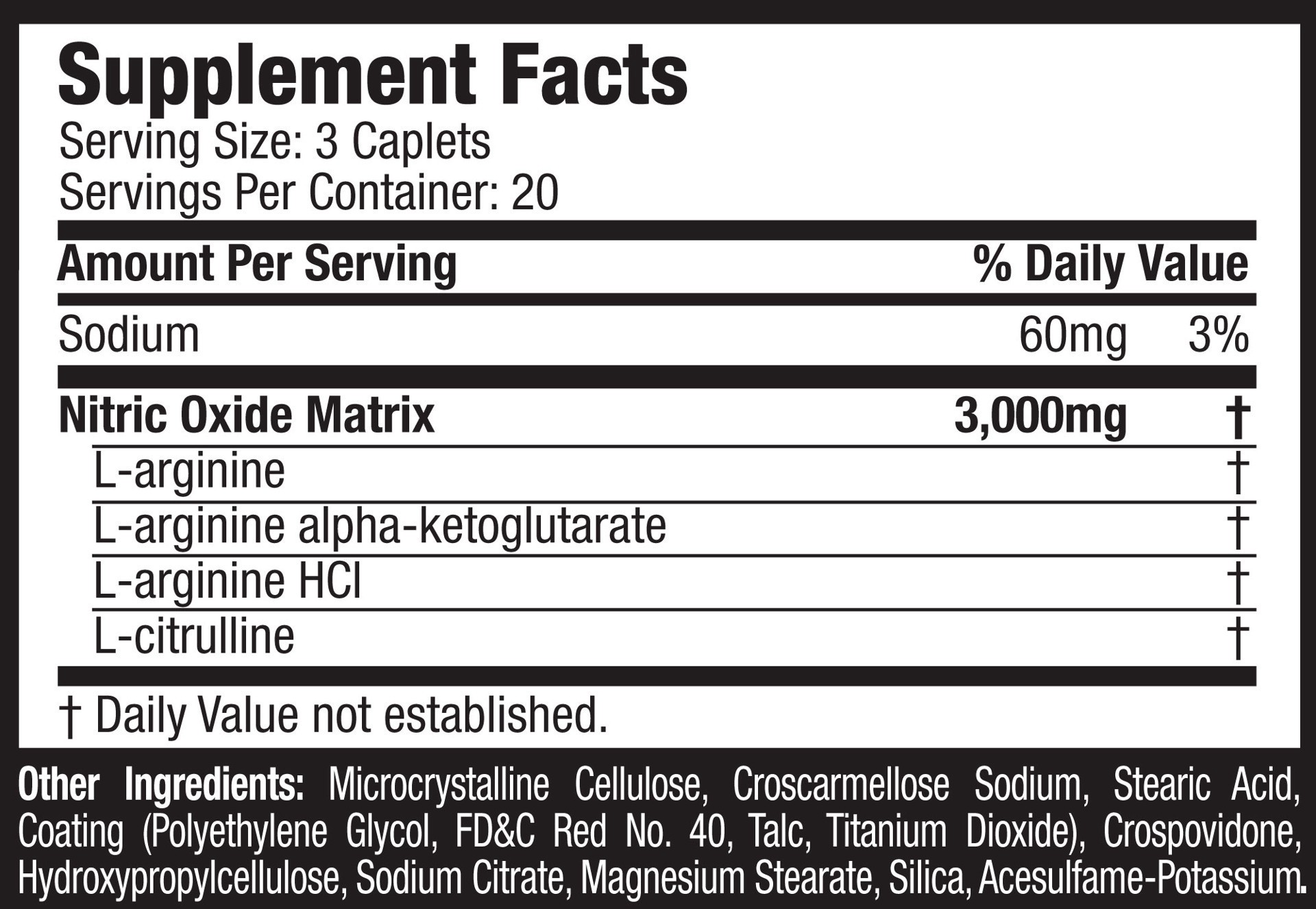Nitric Oxide Matrix: L-Arginine, L-Arginine Alpha-Ketoglutarate, L-Arginine HCl, L-Citrulline. Other Ingredients: Microcrystalline Cellulose, Hydroxypropylcellulose, Coating (Polyethylene Glycol, FD&C…