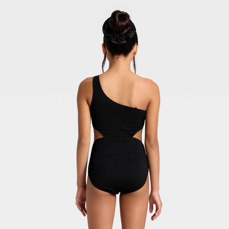 Girls' Scallop Puff Jacquard One Piece Swimsuit - art class™ Black L