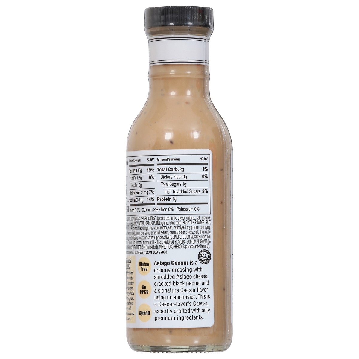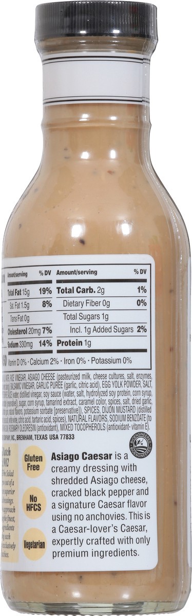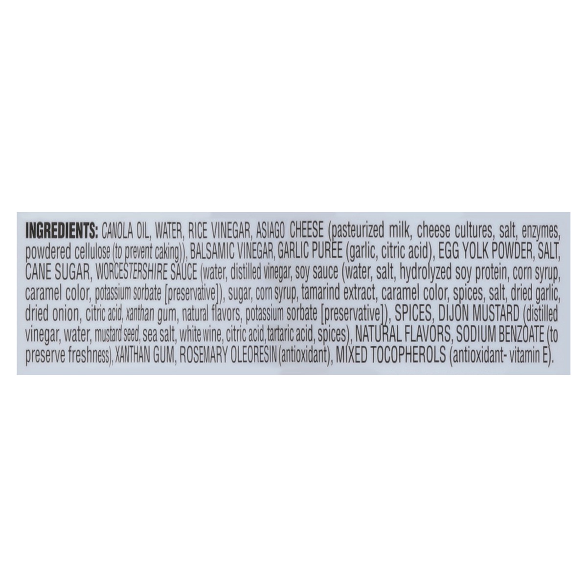 Canola Oil, Water, Rice Vinegar, Asiago Cheese (Pasteurized Milk, Cheese Cultures, Salt, Enzymes, Powdered Cellulose (to Prevent Caking)), Balsamic Vinegar, Garlic Puree (Garlic, Citric Acid), Egg Yol…