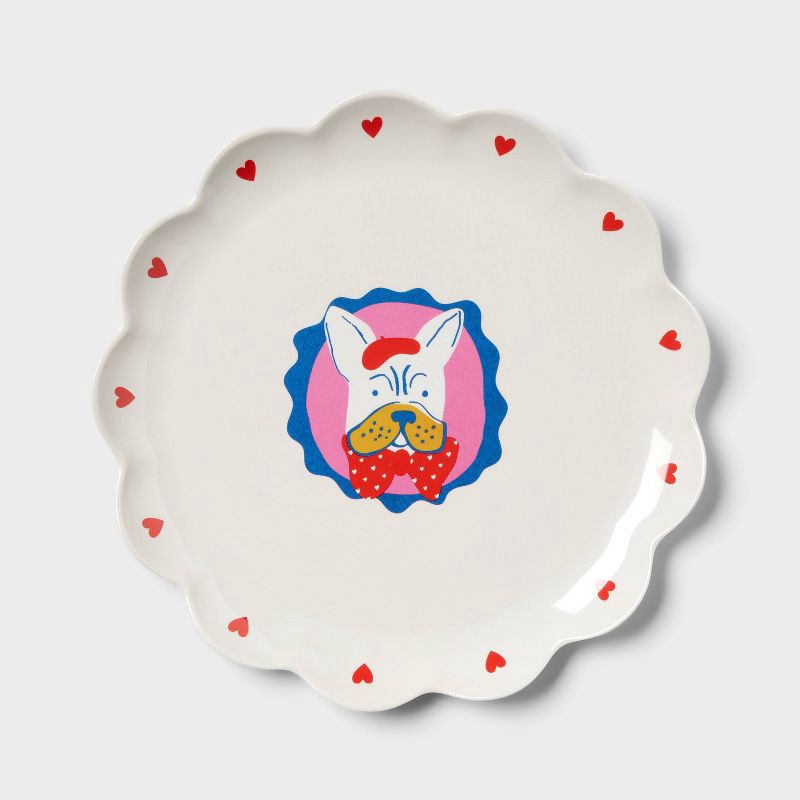 Add a fun touch to your kid's tablescape with this Scallop Novelty Dog Dinner Plate from Pillowfort™. Made from BPA-free bamboo and melamine, this dinner plate features scalloped edges with heart prin…