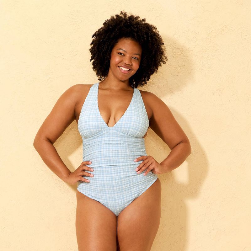 Soak up the sun in style with this Gingham Pucker Plunge One-Piece Swimsuit from Shade & Shore™. Made from recycled polyester-nylon blend fabric with spandex and full lining for flexible comfort, this…