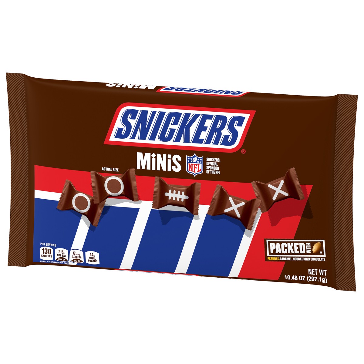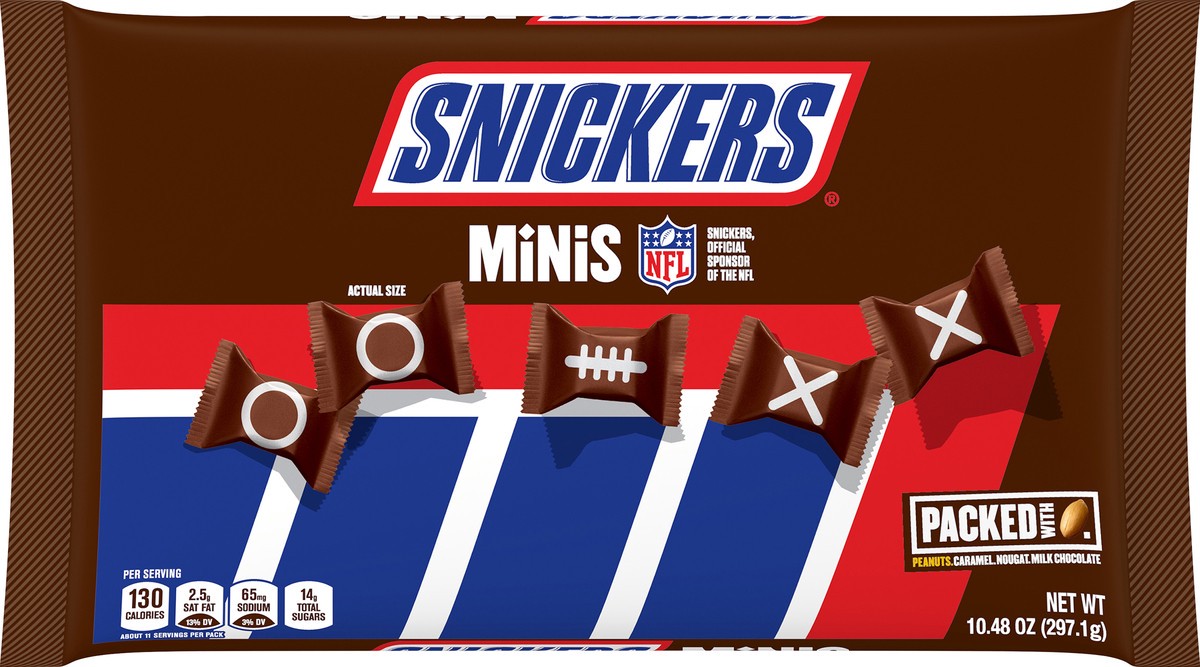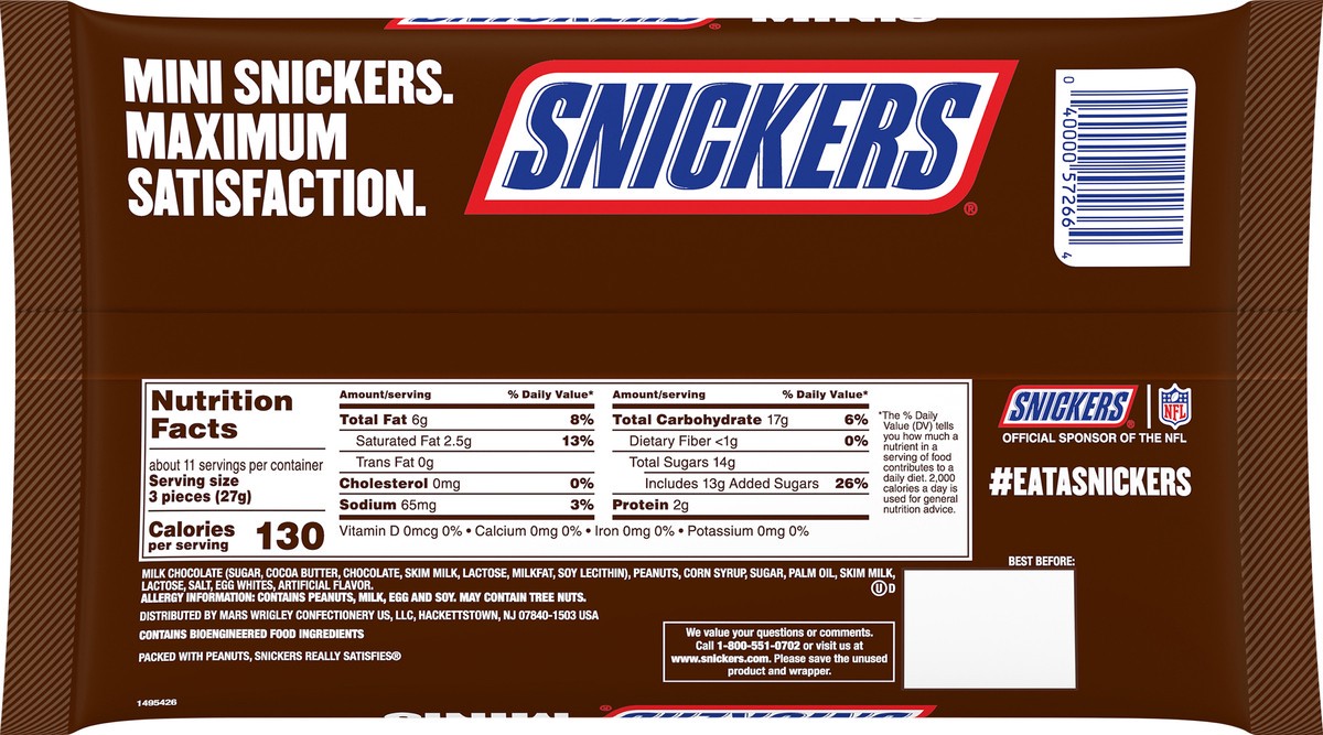 Packed with peanuts. Caramel. Nougat. Milk chocolate. Per Serving: 130 calories; 2.5 g sat fat (13%DV); 65 mg sodium (3%DV); 14 g total sugars. About 11 serving per pack. Contains bioengineered food i…