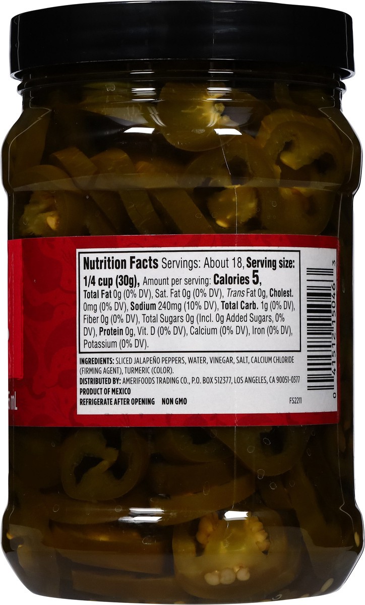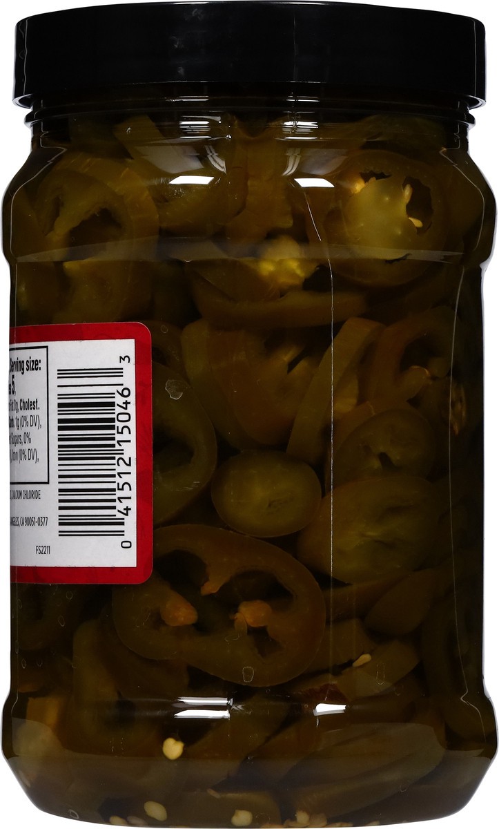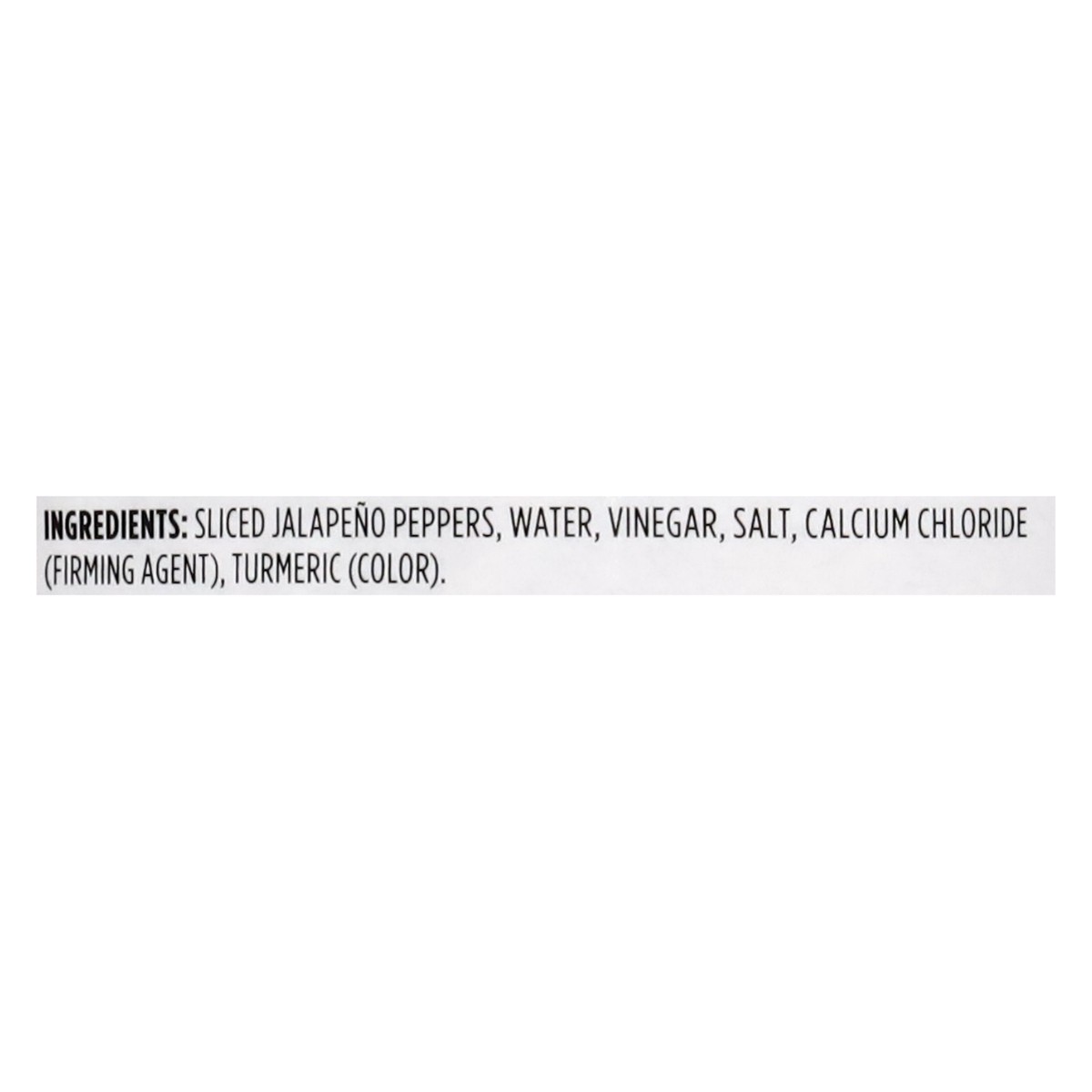 Sliced Jalapeno Peppers, Water, Vinegar, Salt, Calcium Chloride (Firming Agent), Turmeric (Color).