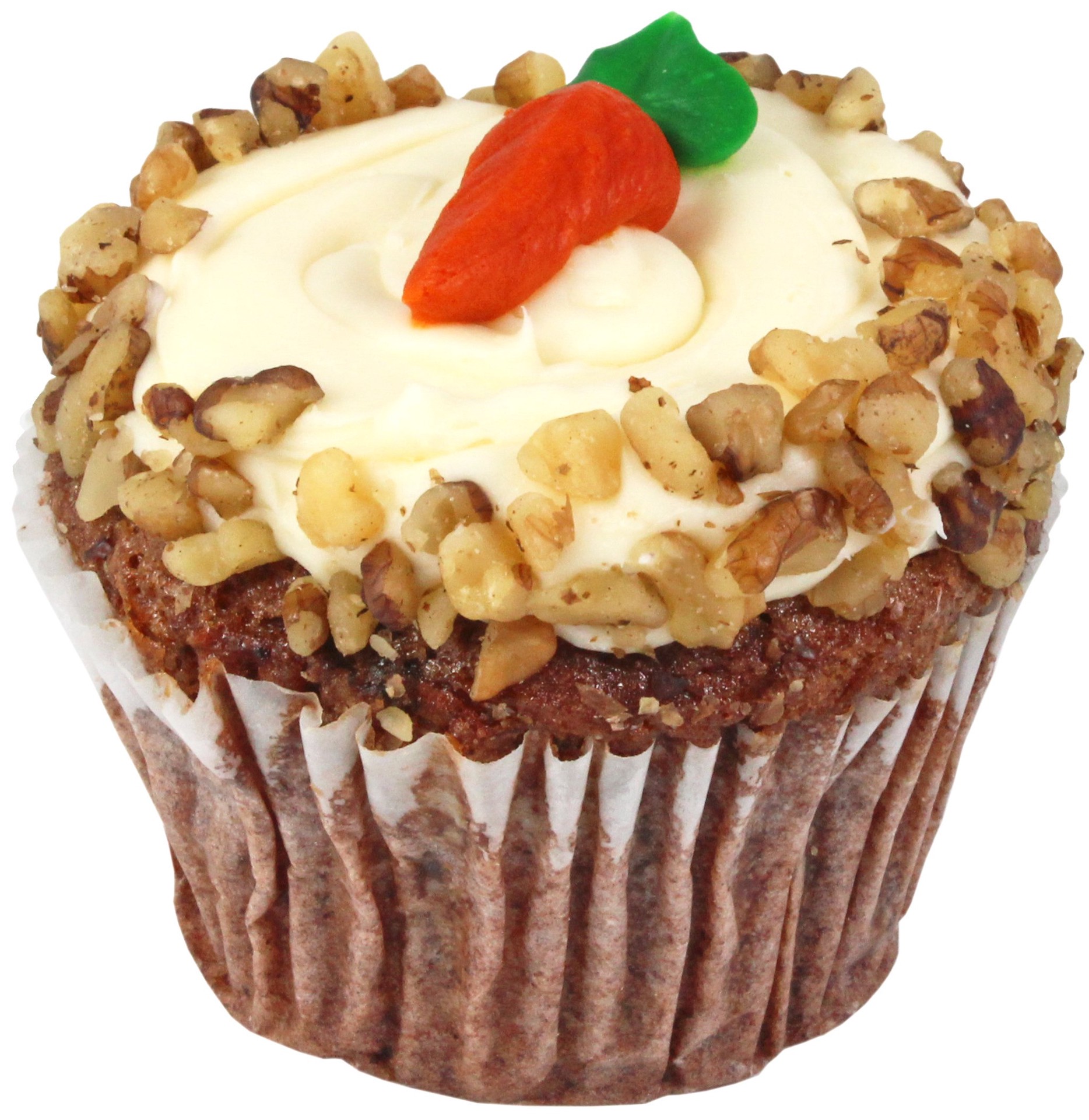 Very moist cinnamon spiced cupcake made with shredded carrots & walnuts. Iced with cream cheese icing