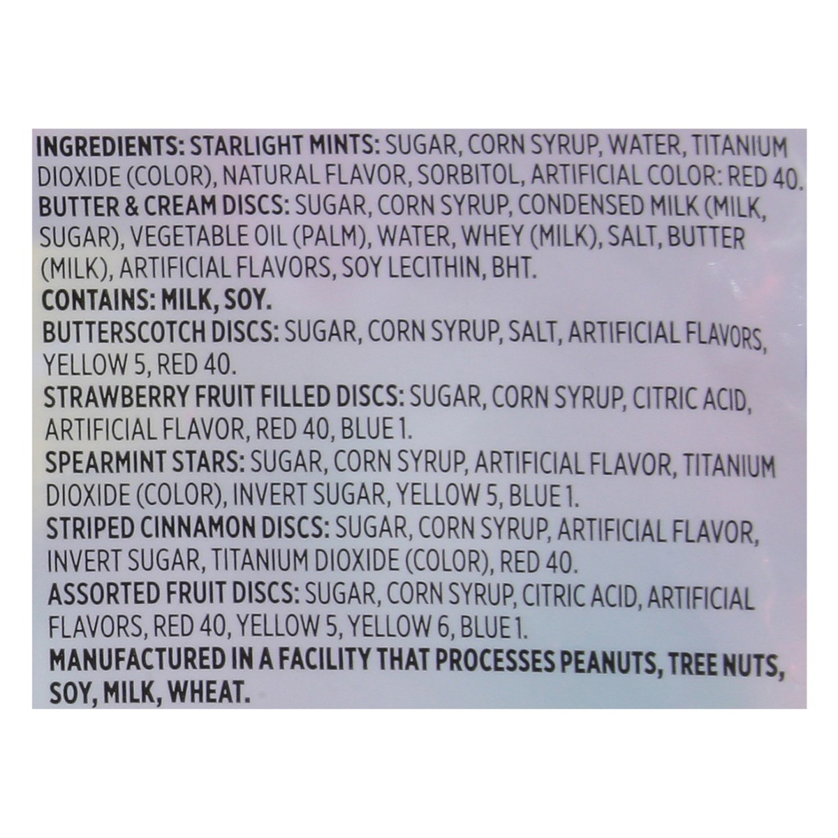 Starlight Mints: Starlight Mints: Sugar, Corn Syrup, Water, Titanium Dioxide (Color), Natural Flavor, Sorbitol, Artificial Color, Red 40. Butter & Cream Discs: Butter & Cream Discs: Sugar, Corn Syrup,…