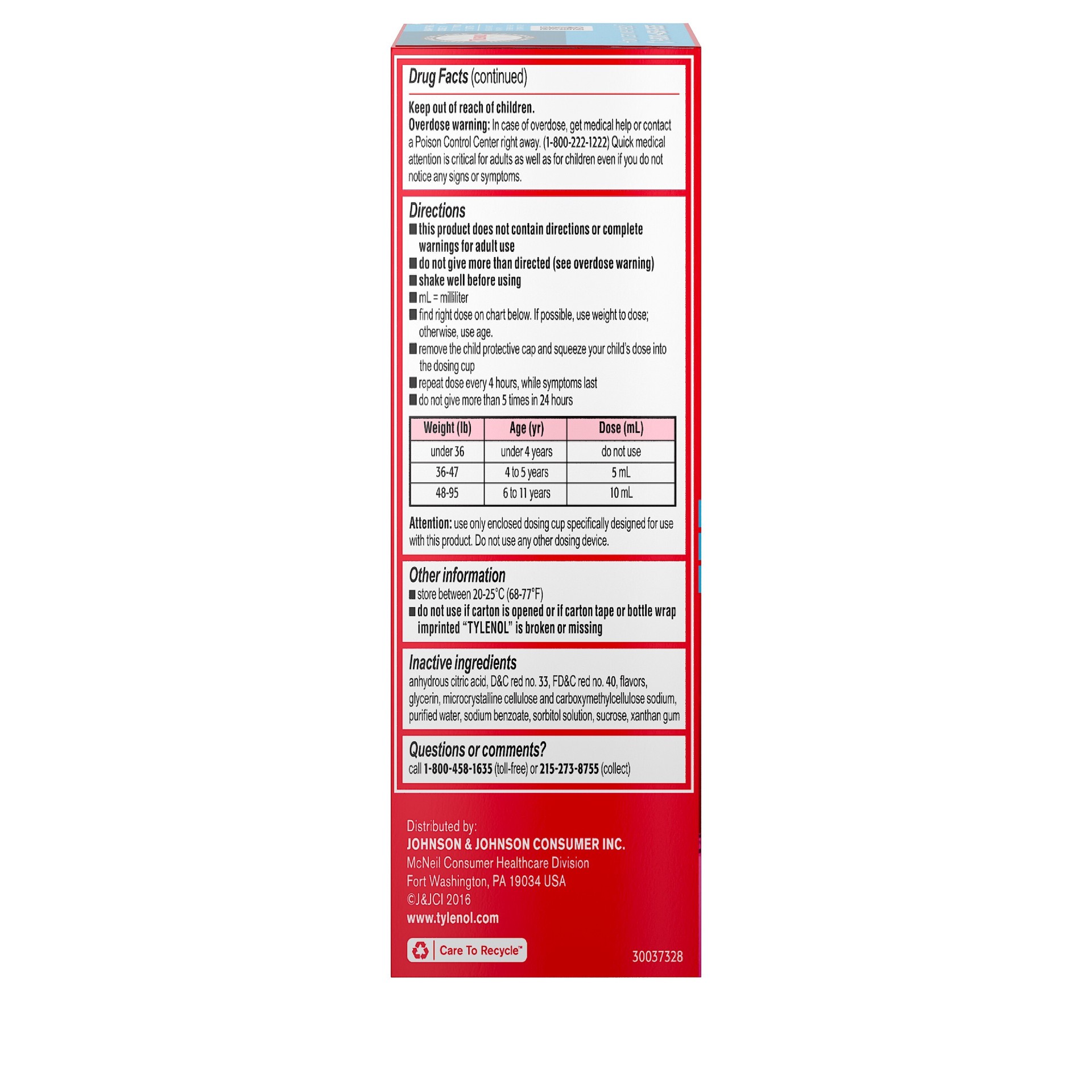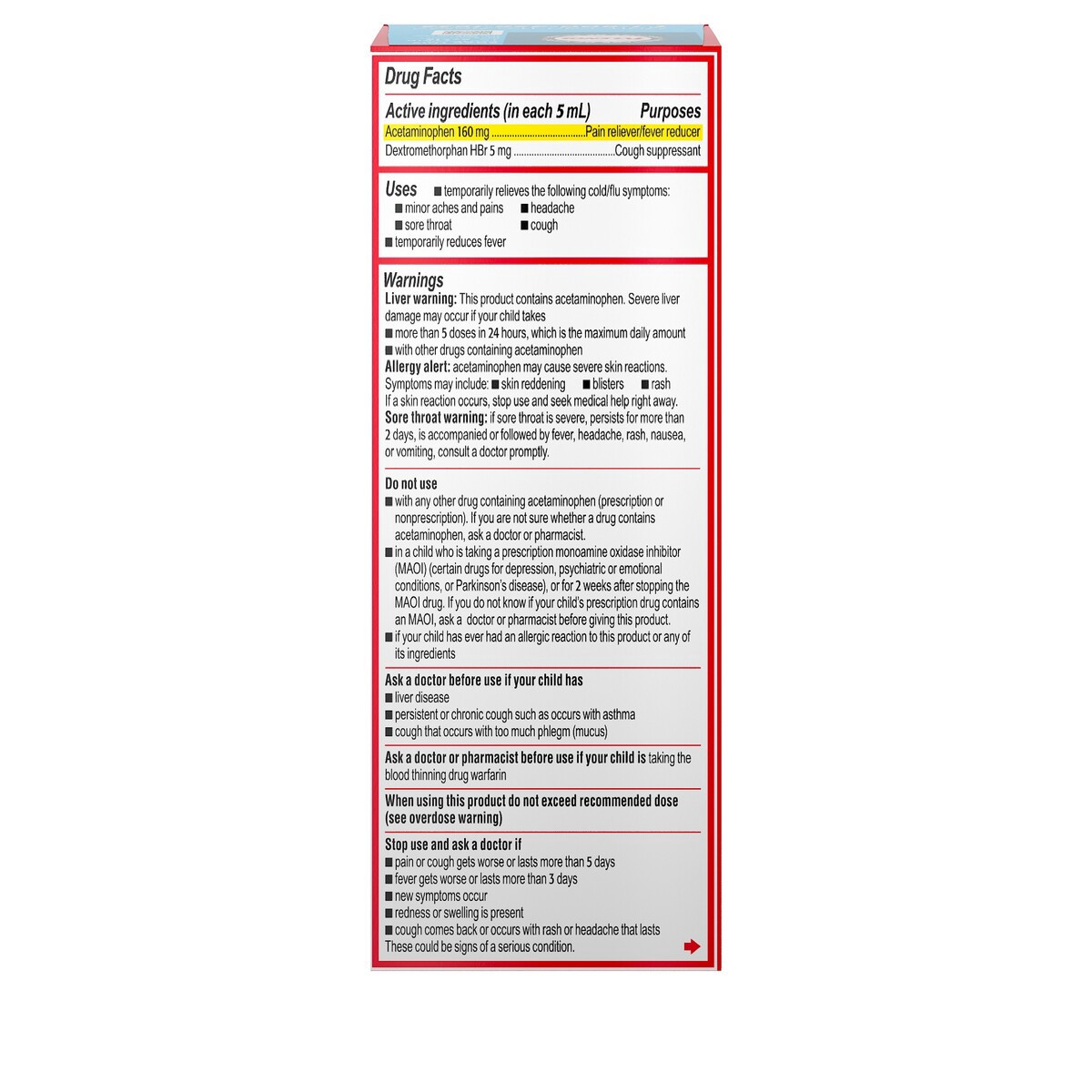 Active ingredients (in each 5 mL) Acetaminophen 160 mg Dextromethorphan HBr 5 mg Purposes Pain reliever/fever reducer Cough suppressant Inactive ingredients anhydrous citric acid, D&C red no. 33, …