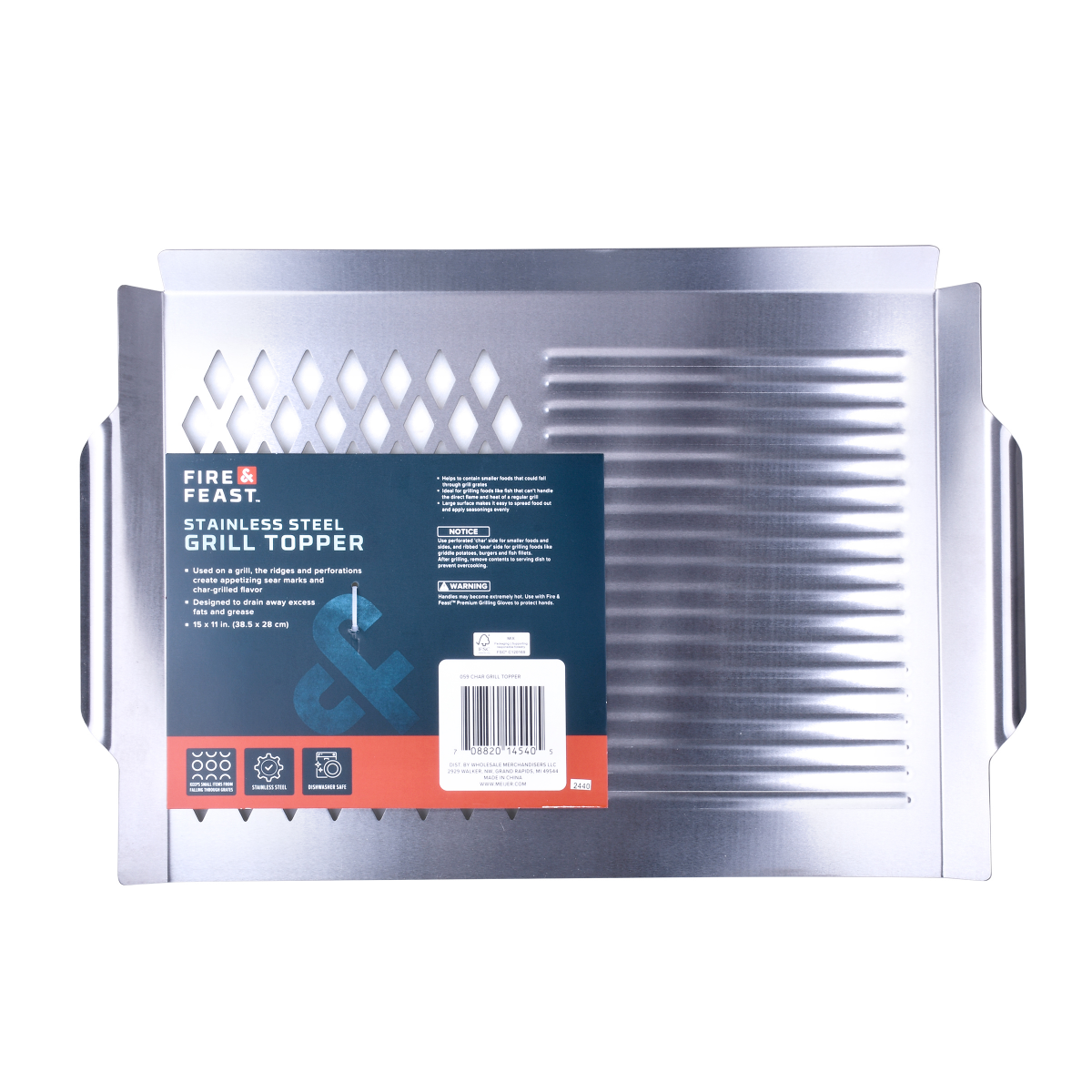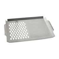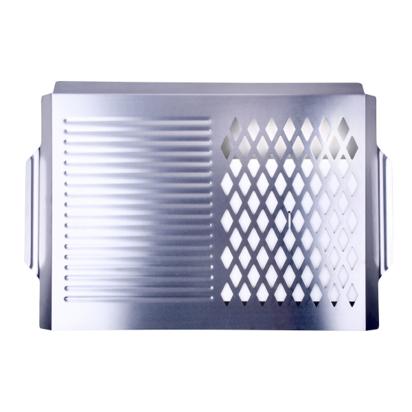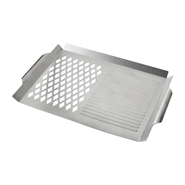 430 Stainless steel material.Product Size: 18.7 in x 11.22 in, Grill Area Size: 15 in x 11in. Caution - handles may become extremely hot. Always use BBQ gloves when handling.