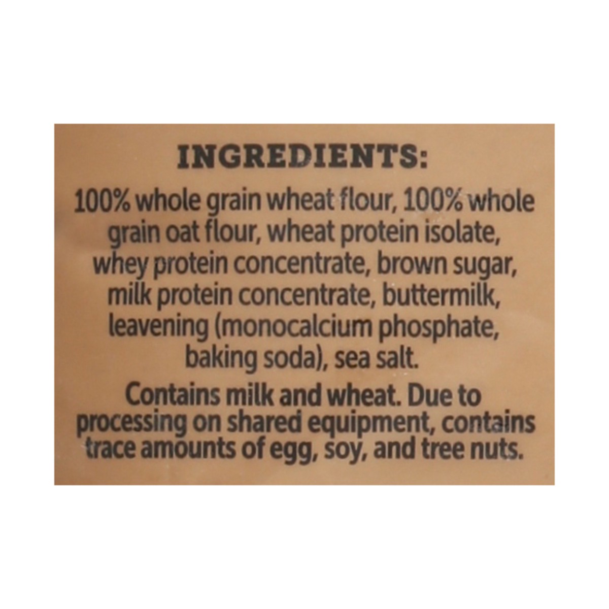 100% Whole Grain Wheat Flour, 100% Whole Grain Oat Flour, Wheat Protein Isolate, Whey Protein Concentrate, Brown Sugar, Milk Protein Concentrate, Buttermilk, Leavening (Monocalcium Phosphate, Baking S…