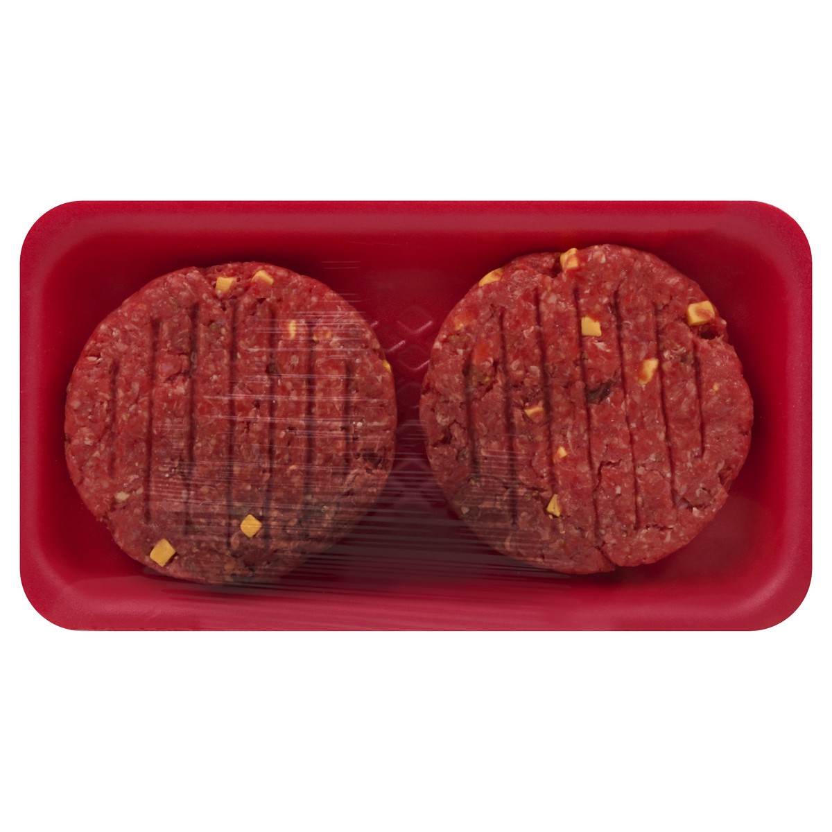 Ground Beef, Cheddar Cheese (Cultured Pasteurized Milk, Water, Salt Enzymes), Milk Fat, Sodium Phosphate, Potassium Sorbate, Annatto, Paprika and Tumeric Extract (for Coloring), Potato Starch/Powdered…