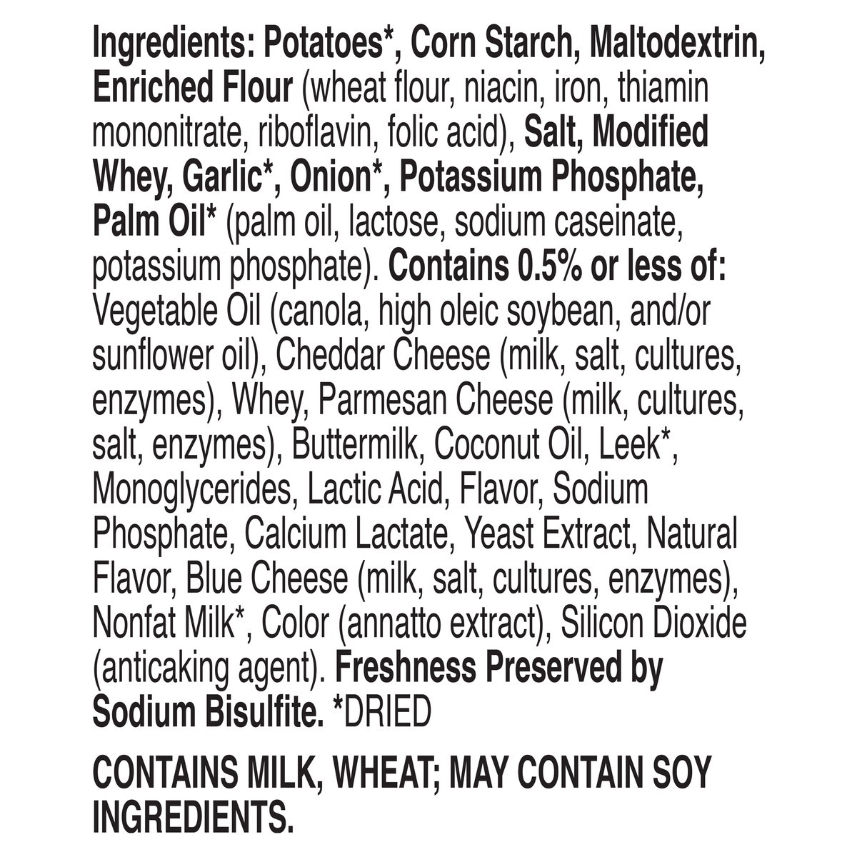 Potatoes*, Corn Starch, Maltodextrin, Enriched Flour (Wheat Flour, Niacin, Iron, Thiamin Mononitrate, Riboflavin, Folic Acid), Salt, Modified Whey, Garlic*, Onion*, Potassium Phosphate, Palm Oil* (Pal…