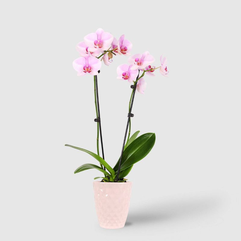 - Pink/purple Phalaenopsis orchid in heart-shaped pot