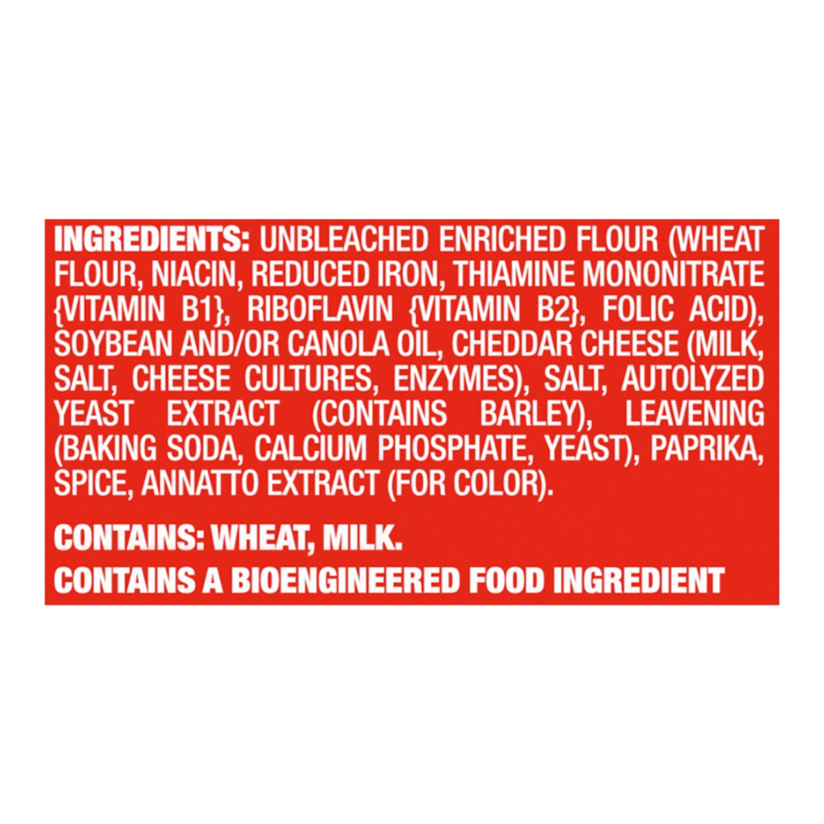 INGREDIENTS: UNBLEACHED ENRICHED FLOUR (WHEAT FLOUR, NIACIN, REDUCED IRON, THIAMINE MONONITRATE {VITAMIN B1}, RIBOFLAVIN {VITAMIN B2}, FOLIC ACID), SOYBEAN AND/OR CANOLA OIL, CHEDDAR CHEESE (MILK, SAL…