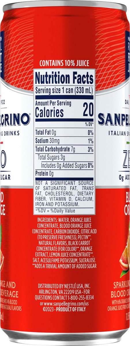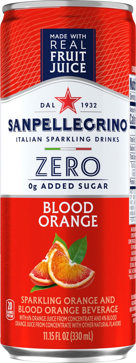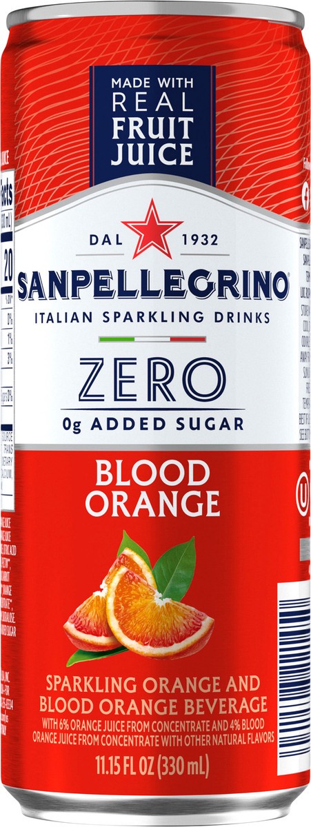 With Italian Fruit Juice, DAL 1932, Sanpellegrino Italian Sparkling Drinks, Zero, 0G Added Sugar, Blood Orange, Follow Us On, FOR QUESTIONS CONTACT 1-800-255-8334 or www.sanpellegrino.com/us.