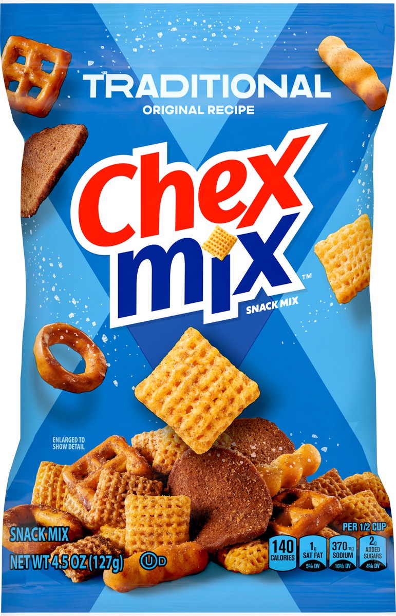 Why settle for a boring snack, with every bite the same? Chex Mix Traditional is a savory mix of Chex cereal pieces, pretzels, mini breadsticks and crispy crackers seasoned to unique and bold perfecti…