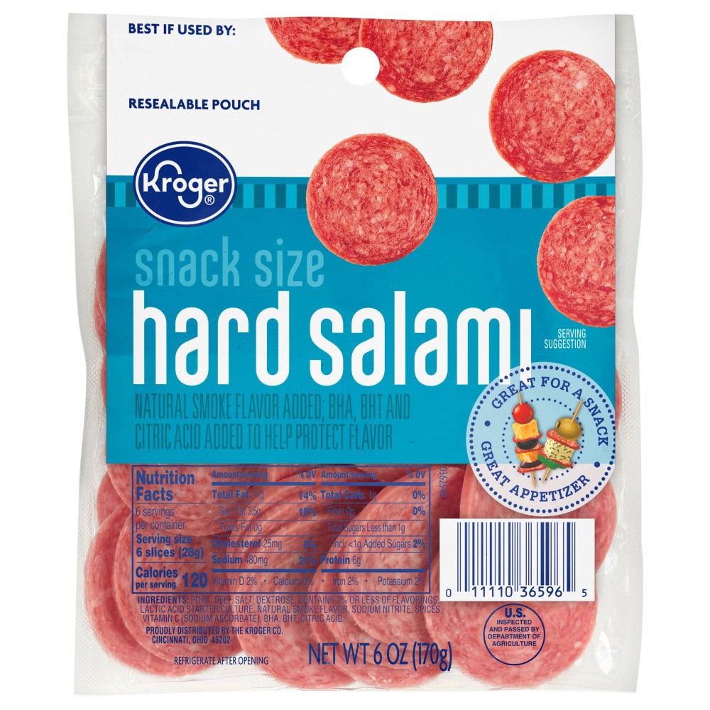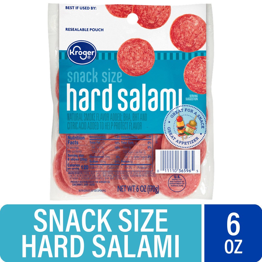 Kroger® Snack Size Hard Salami is marvelously meaty! With a tasty blend of pork and beef, every bite is satisfying. Natural smoke flavoring and spices elevate the snack experience, giving you a top-no…