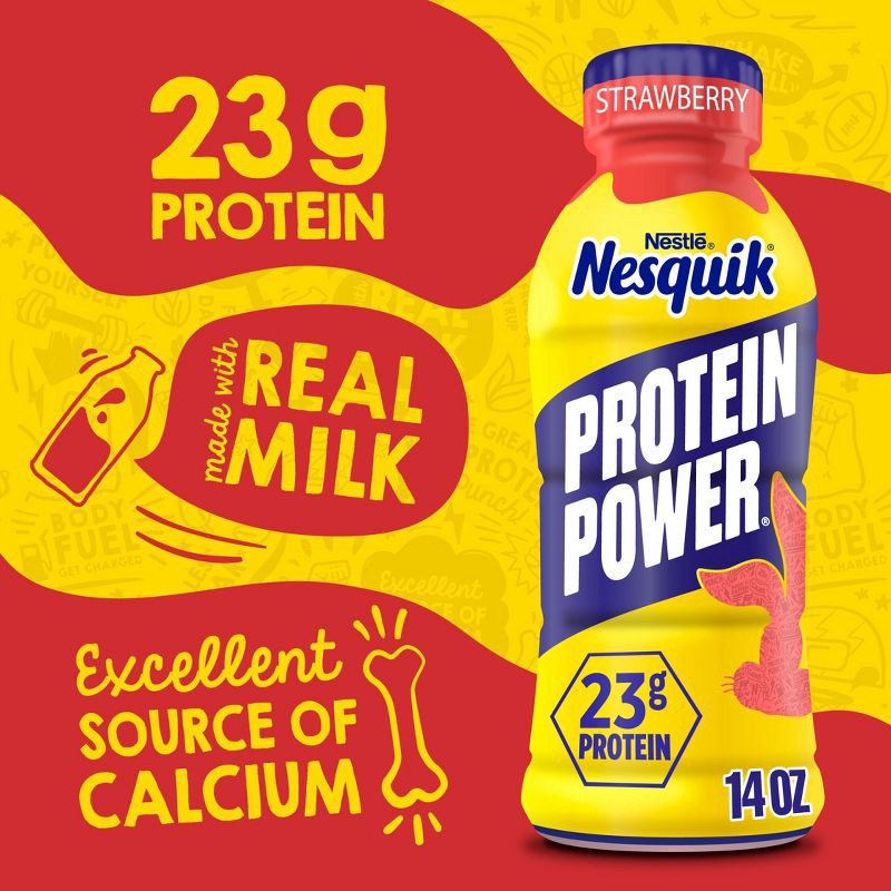 - SIP GREATNESS: With Nesquik Protein Power Strawberry Milk, you can get a refreshing sip of shelf-stable milk containing 23g of protein per bottle No syrup or powder needed