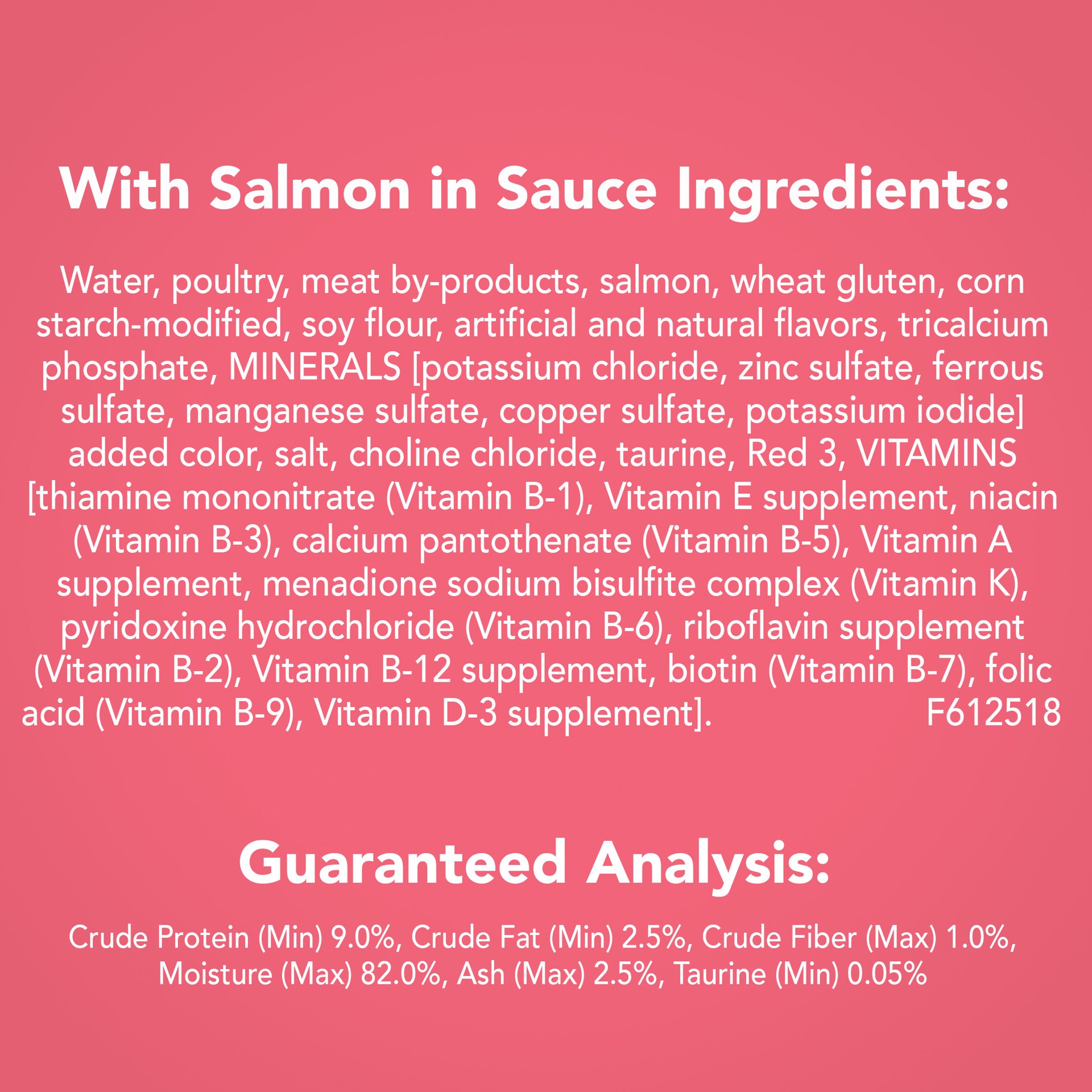 Water, Poultry, Meat By-Products, Salmon, Wheat Gluten, Corn Starch-Modified, Soy Flour, Artificial And Natural Flavors, Tricalcium Phosphate, Minerals [Potassium Chloride, Zinc Sulfate, Ferrous Sulfa…