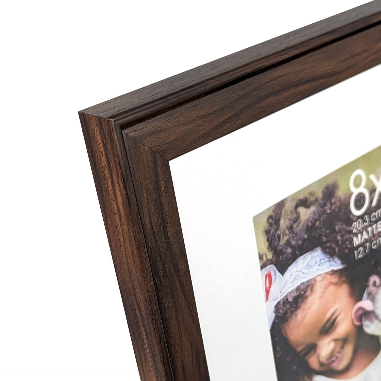 Add this classic walnut frame to your home wall d¿cor. It is perfect for displaying any cherised memory or photograph. Details: Walnut, PS frame and Glass, Built in easel, Available in multiple sizes