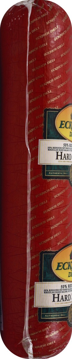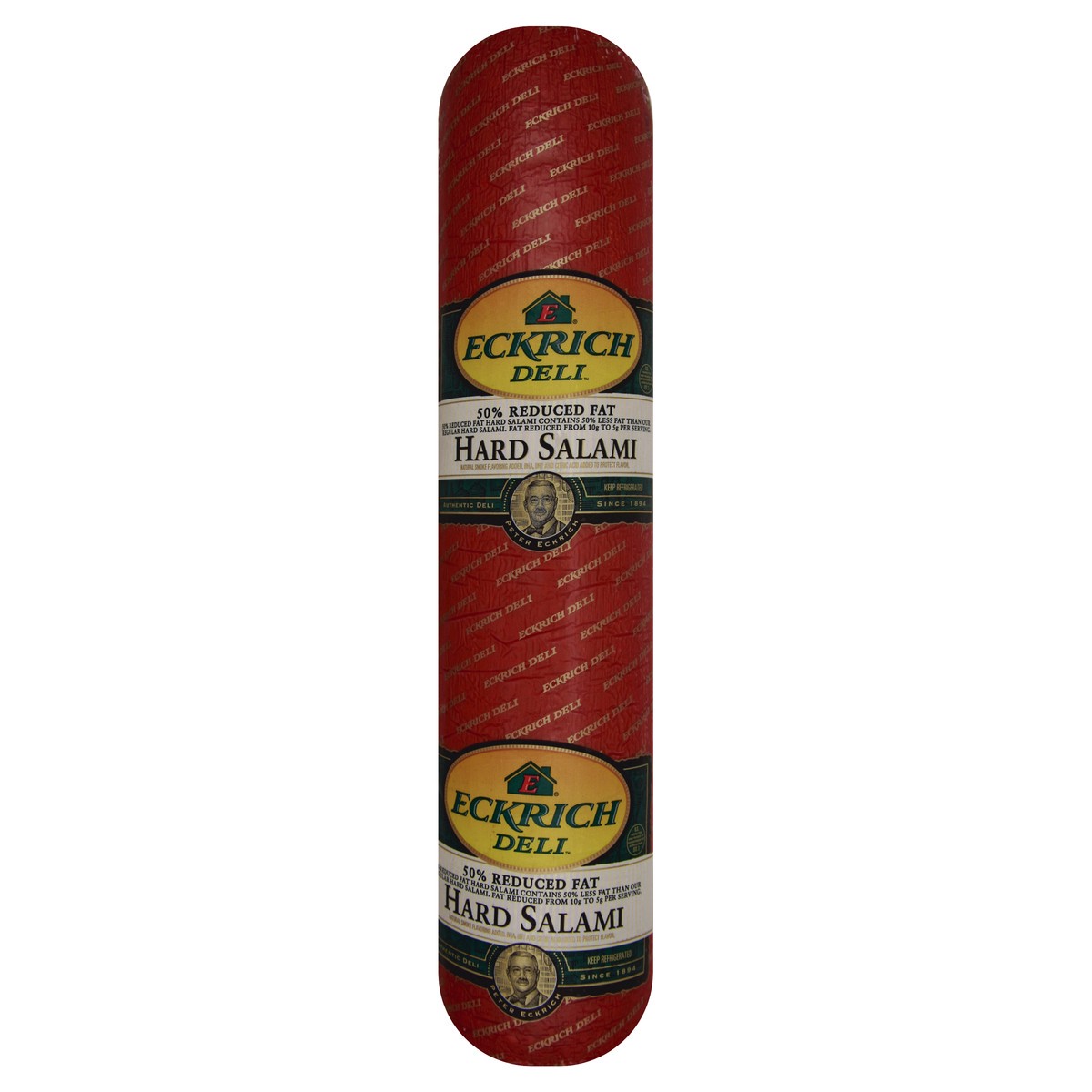50% reduced fat. 50% reduced fat hard. Salami contains 50% less fat than our regular hard salami. Fat reduced from 10 g to 5 g per serving. Natural smoke flavoring added, BHA, BHT and citric acid adde…