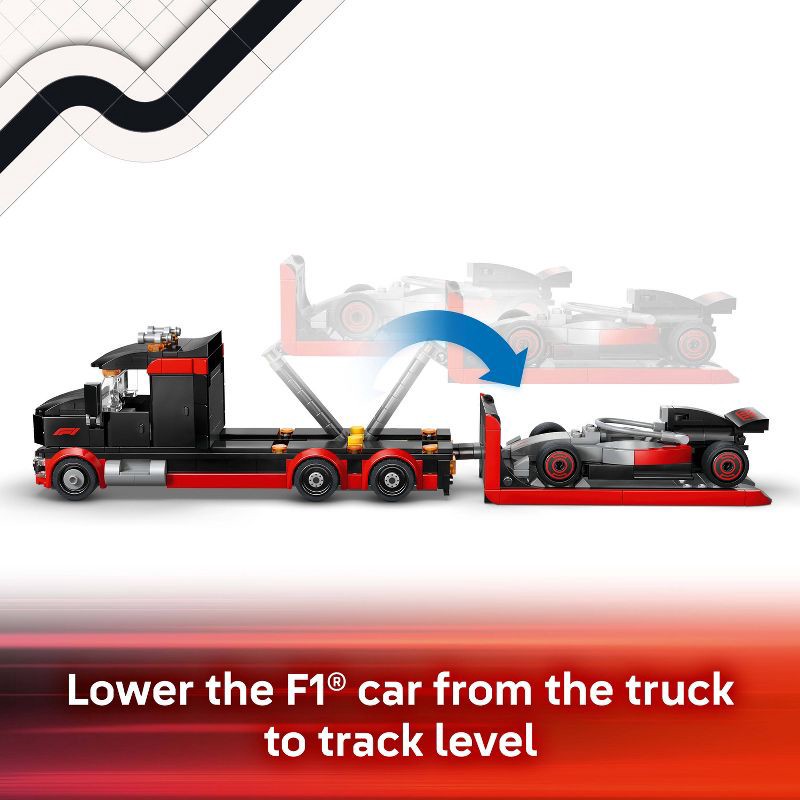 - FEATURES & FUNCTIONS – The buildable Audi F1 race car features slick rubber tires and a detailed cockpit, while the truck includes a driver's cab, an engine bay, storage compartments and 6 rubber tires