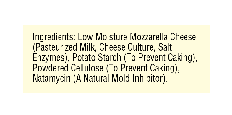 Low Moisture Mozzarella Cheese (Pasteurized Milk, Cheese Culture, Salt, Enzymes), Potato Starch and Powdered Cellulose (TO PREVENT CAKING), NATAMYCIN (A NATURAL MOLD INHIBITOR).