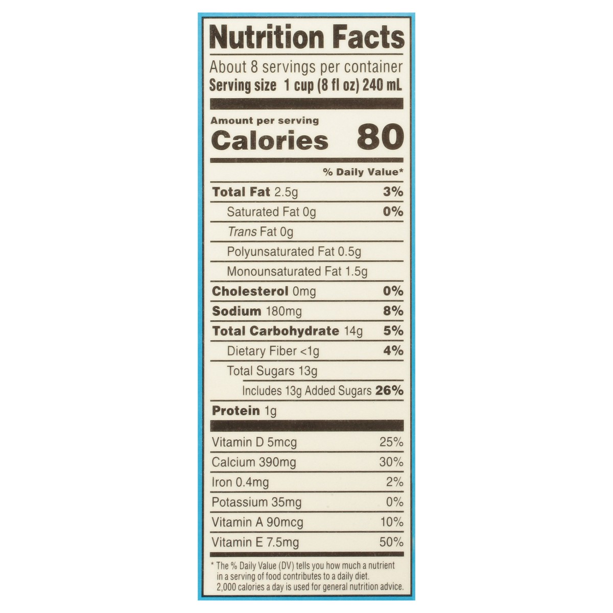 Almondmilk (Filtered Water, Almonds), Cane Sugar, Tricalcium Phosphate, Sea Salt, Natural Flavors, Gellan Gum, Sunflower Lecithin, Locust Bean Gum, Vitamin A Palmitate, Ergocalciferol (Vitamin D2), DL…