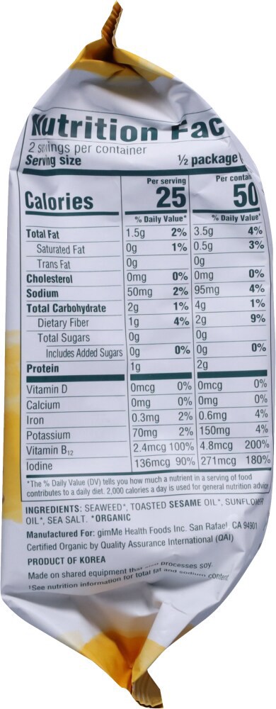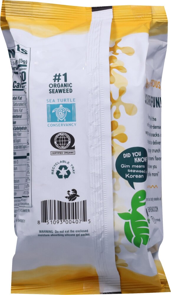 Excellent source of vitamin B12 & iodine. Roasted to light crispy perfection. No. 1 organic seaweed brand. Did you know? Gim means seaweed in Korean. Delicious, nutritious, snackable fun! Powered by o…