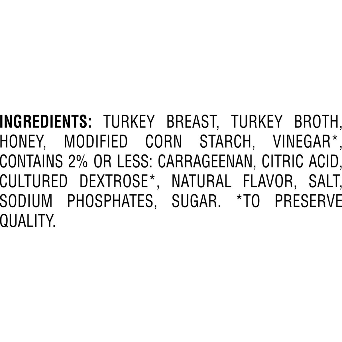 Turkey Breast, Turkey Broth, Honey, Modified Corn Starch, Vinegar*, Contains 2% Or Less: Salt, Sodium Phosphate, Natural Flavorings (Including Celery Juice Powder*), Carrageenan, Sea Salt. *to preserv…